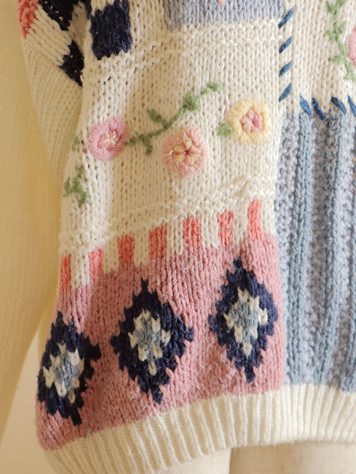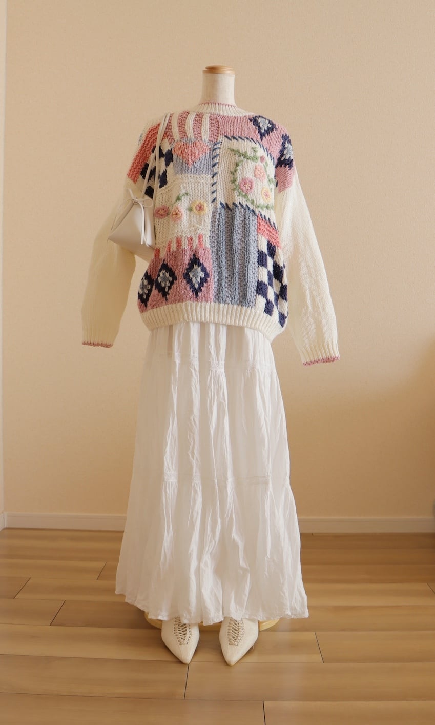 パッチワークのように表現された立体的な編み地が可愛い、春を感じさせてくれる1着です。