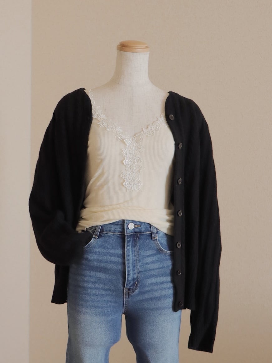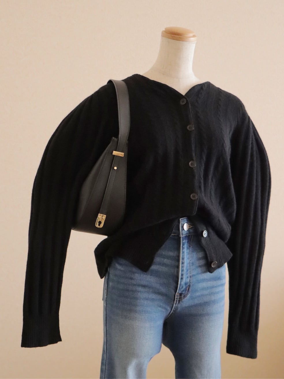 さりげないケーブル編みや凹凸感のあるお袖の編地デザインが可愛いニットカーディガン。