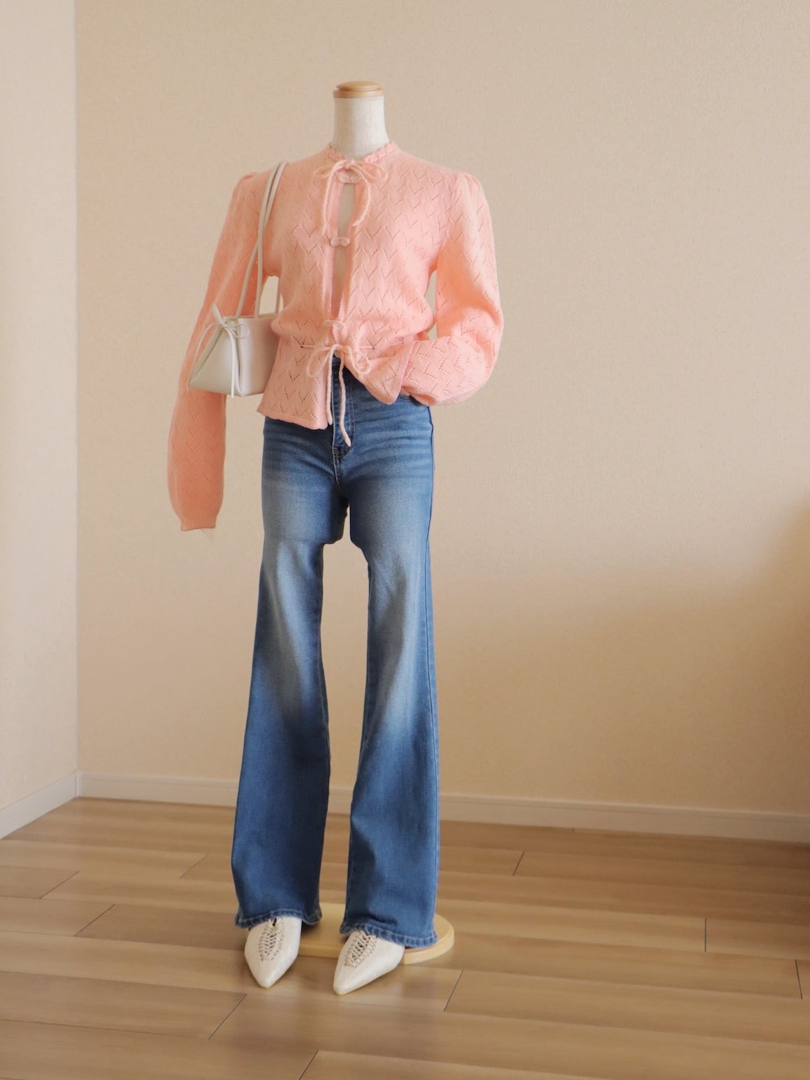 ●pink color ribbon & button design crochet knitted cardigan