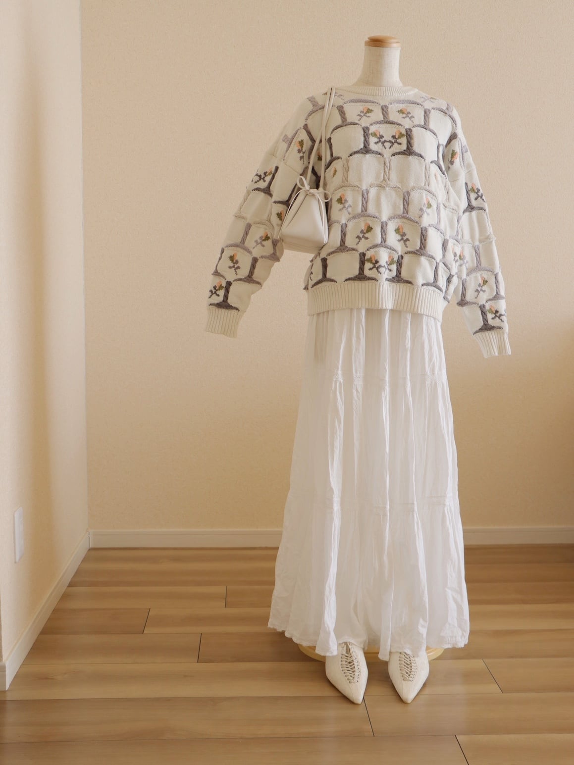 オフホワイトをベースに、グラデーションになった編地の配色は主張しすぎず優しく控えめな色味で、全体的に甘くなりすぎず大人な印象に◎