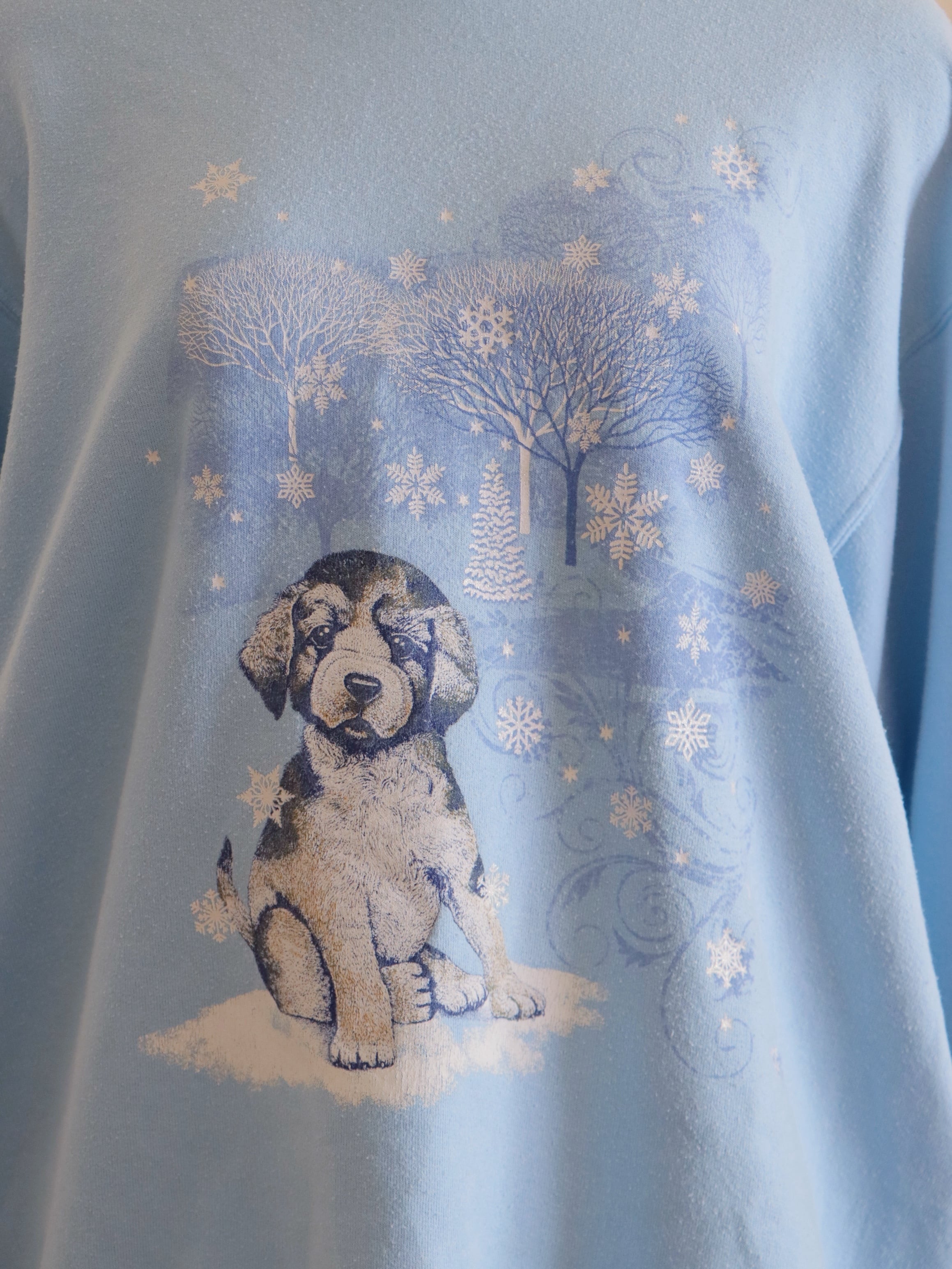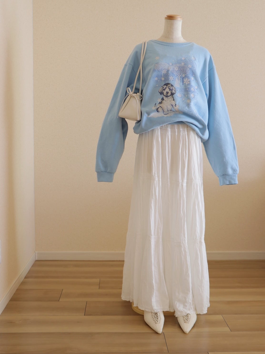 フロントの繊細な雪柄や犬のプリントが目を惹く、春先にお勧めのアイテムです。