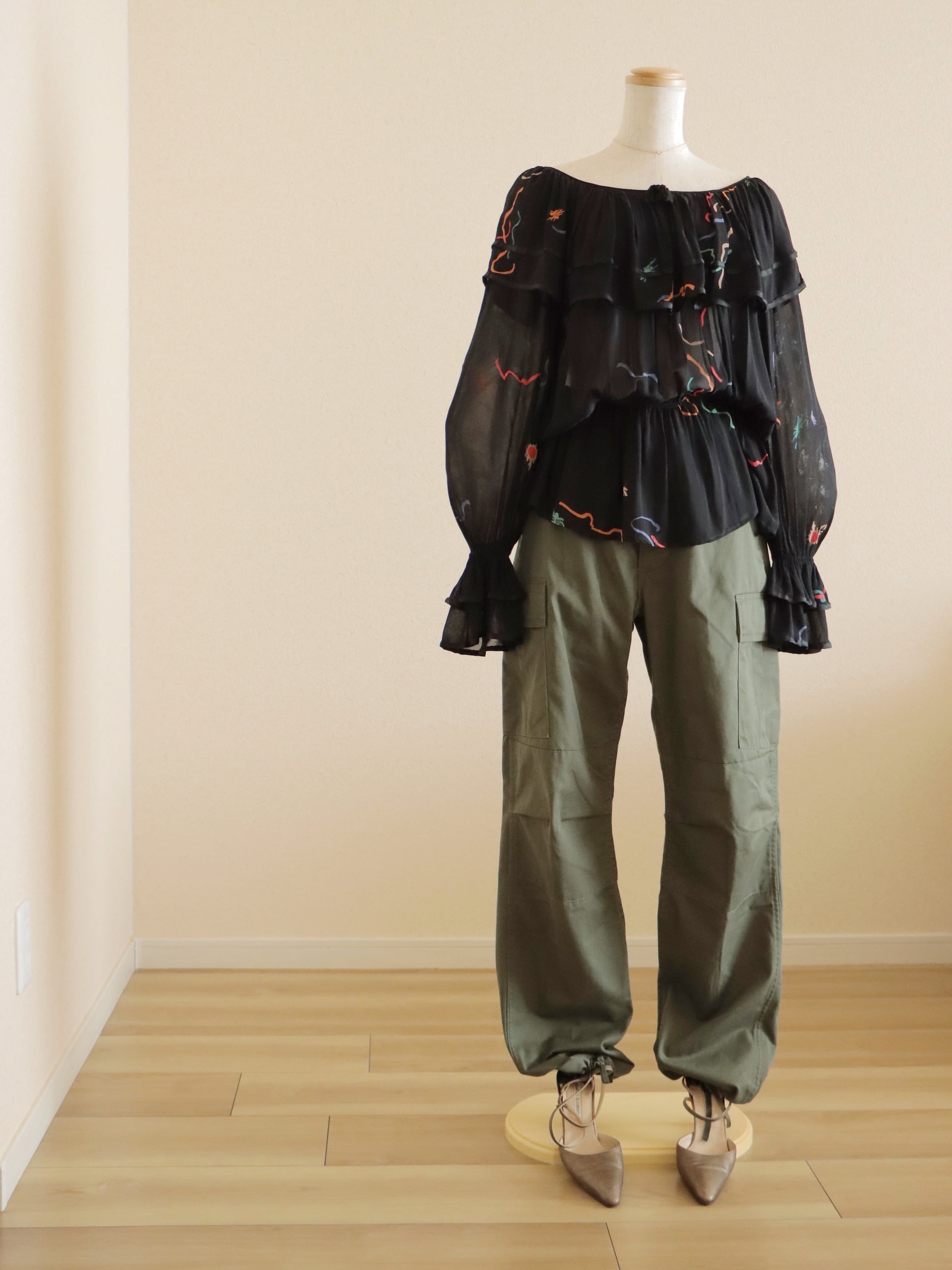 全体的にすっきりとしたシルエット感で、女性らしい雰囲気も出したミリタリーパンツ。