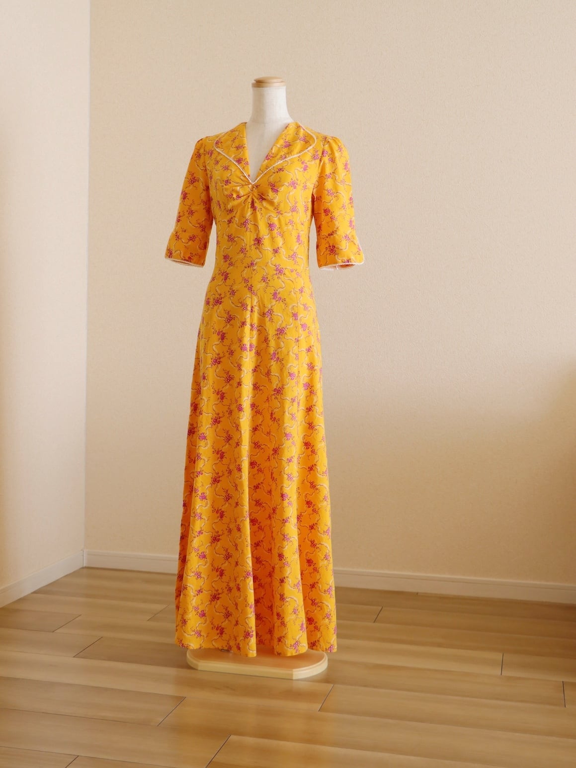 春を感じさせてくれるカラーが目を惹く、70年代頃のロングドレス。