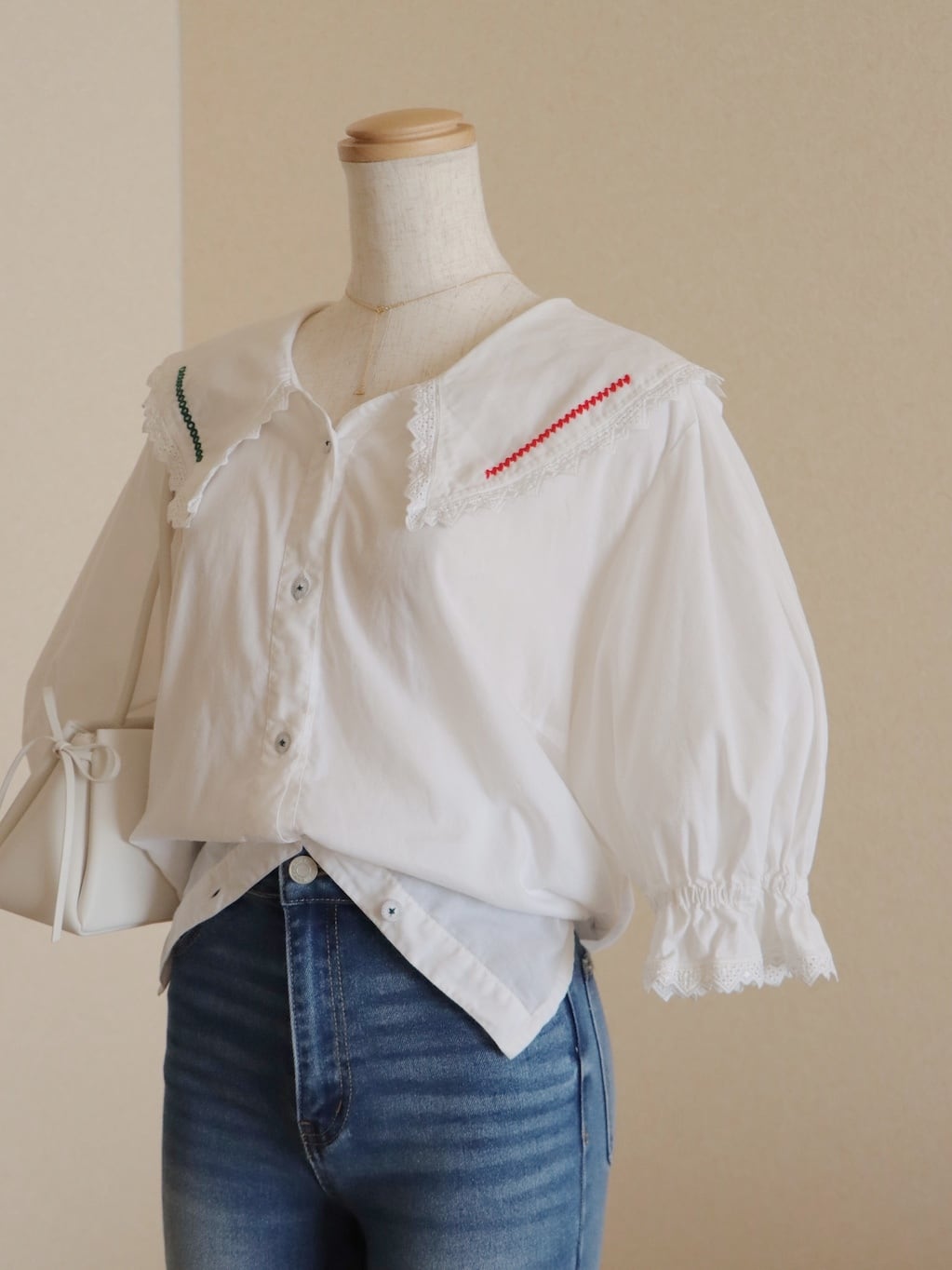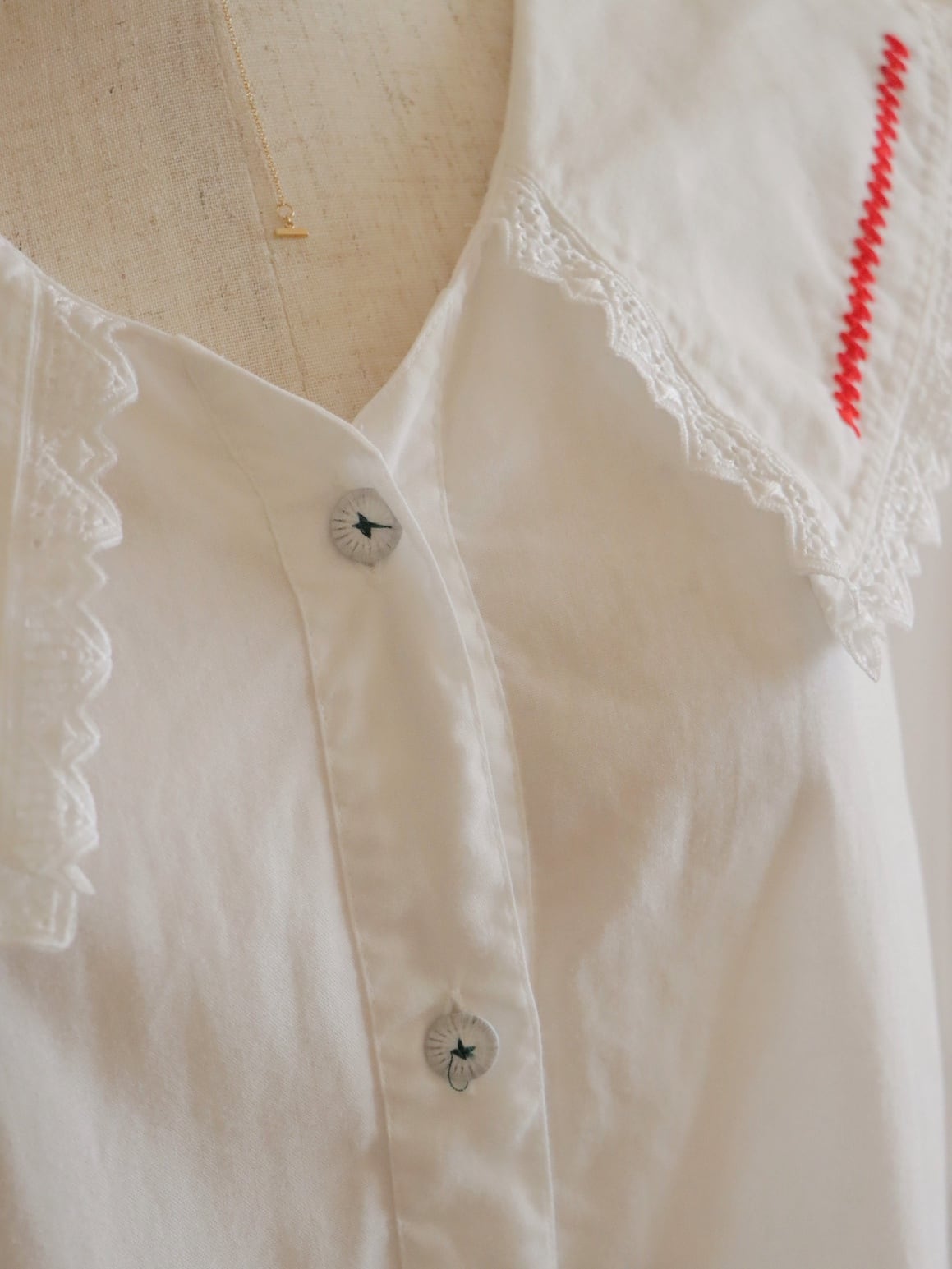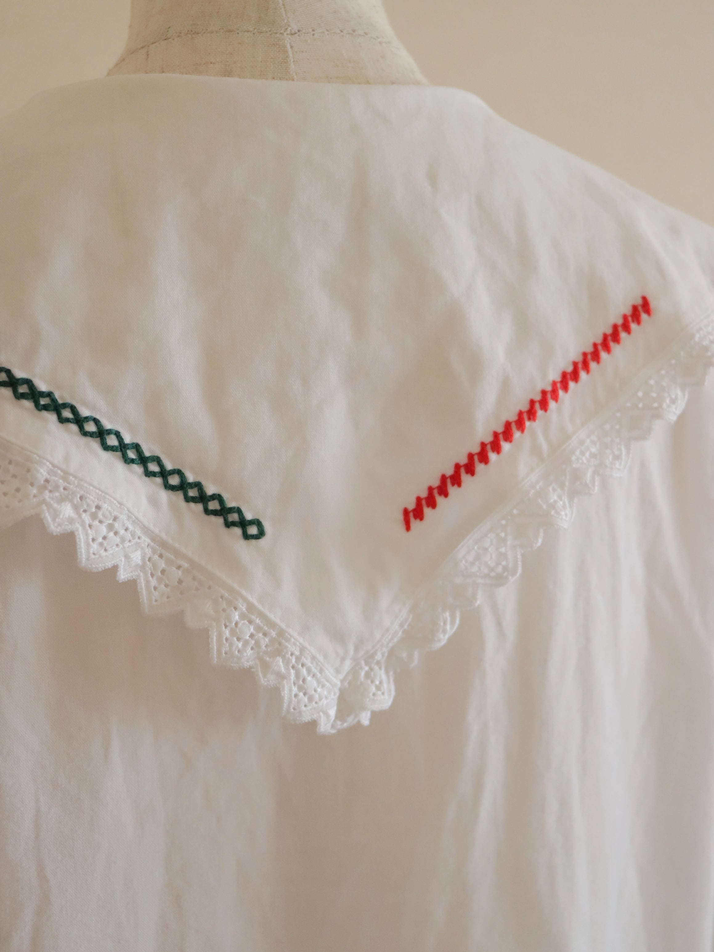 繊細なレース使いは勿論、前後に入った赤&緑のデザイン刺繍や刺繍ボタンがアクセントになった、遊び心溢れる1着です。