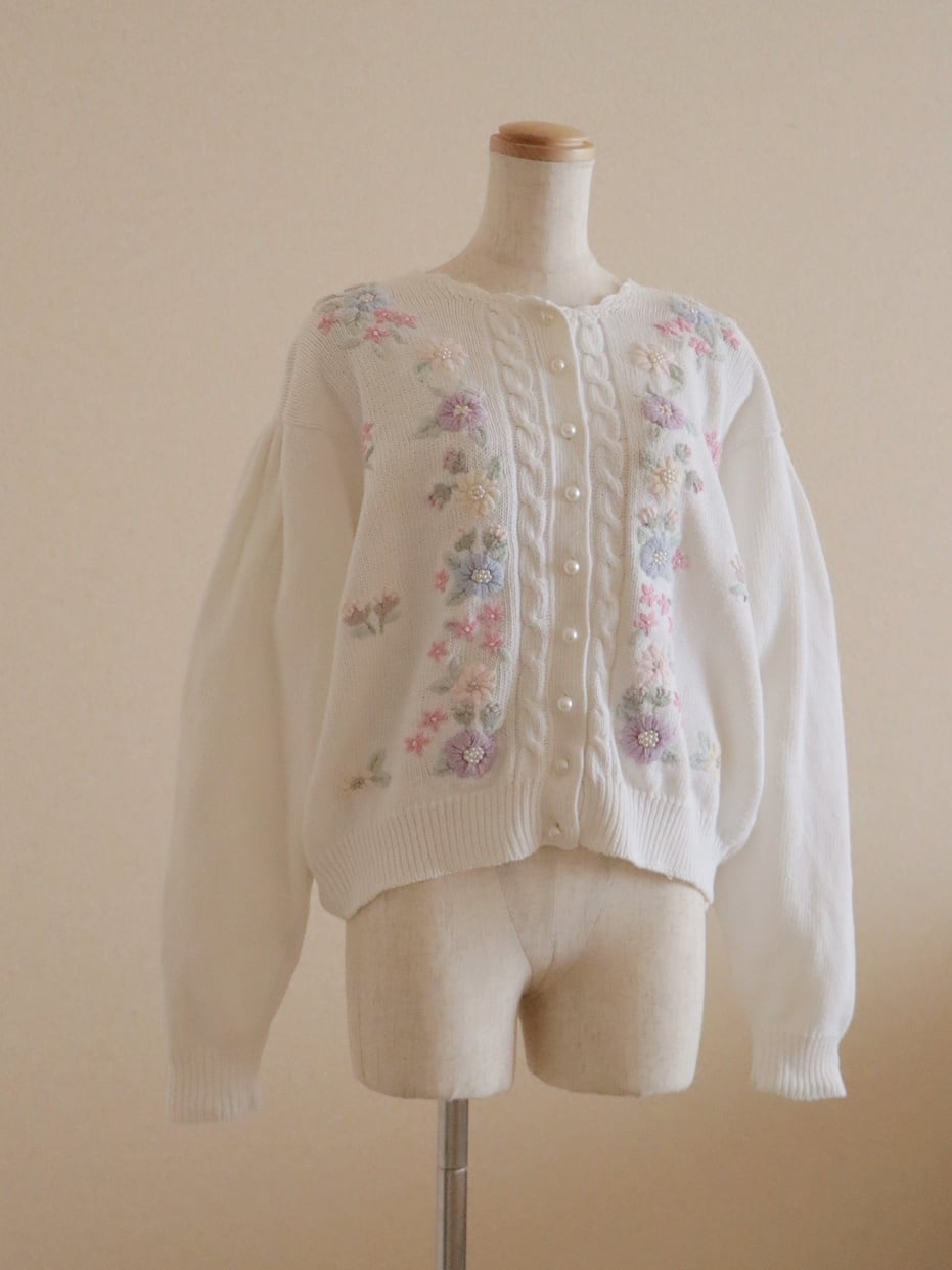 ●90s flower embroidery & pearl button cable detail cotton cardigan