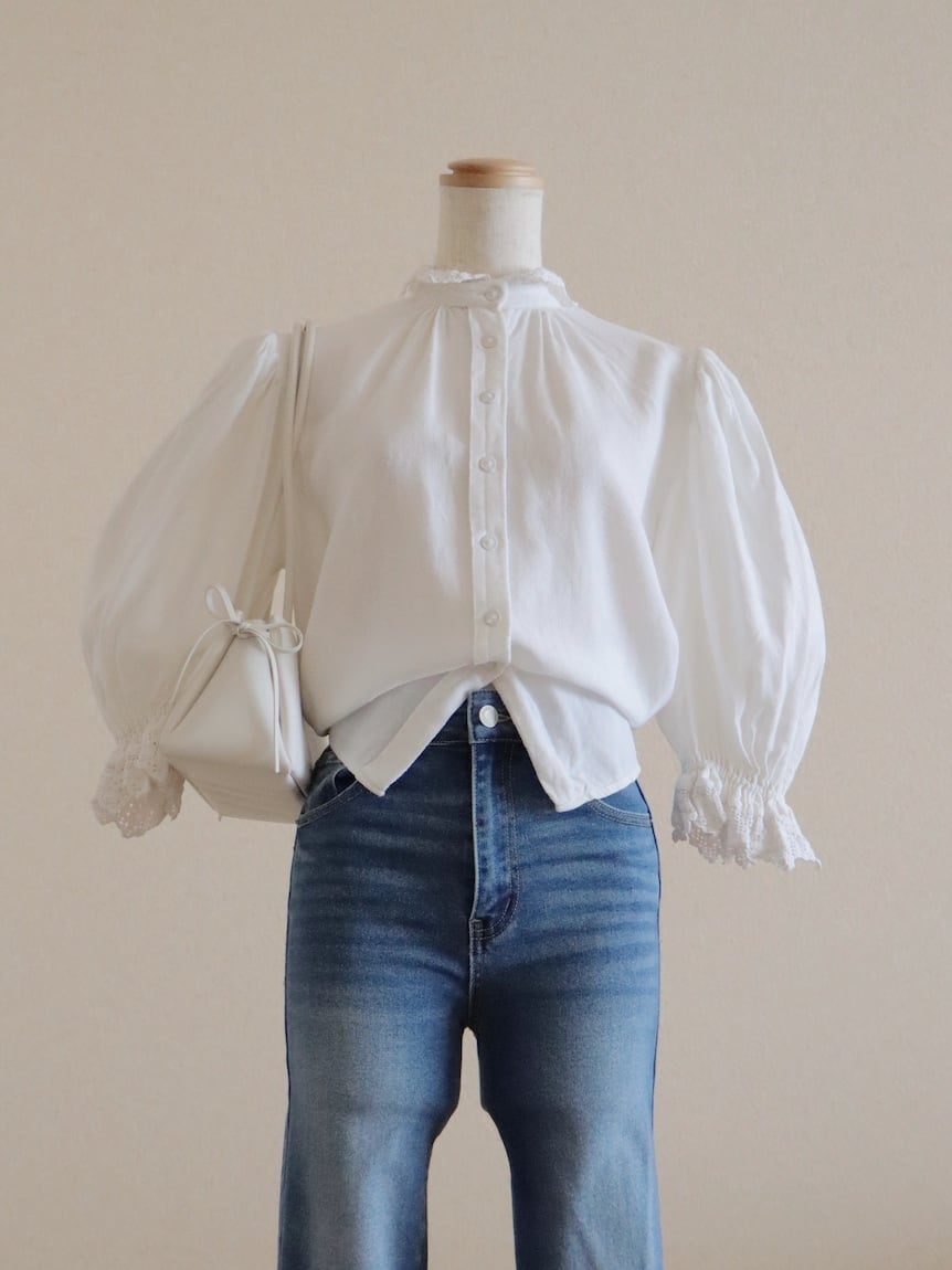 ふんわりとしたパフスリーブに、フロントの刺繍ボタン、繊細なレースが襟と袖口に施された、雰囲気溢れる1着です。