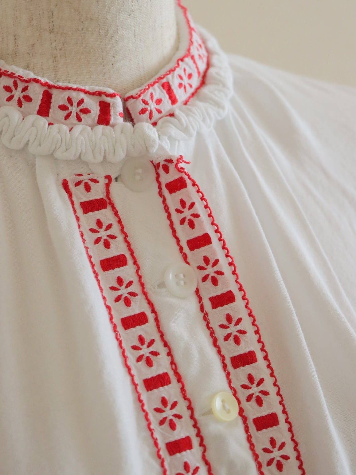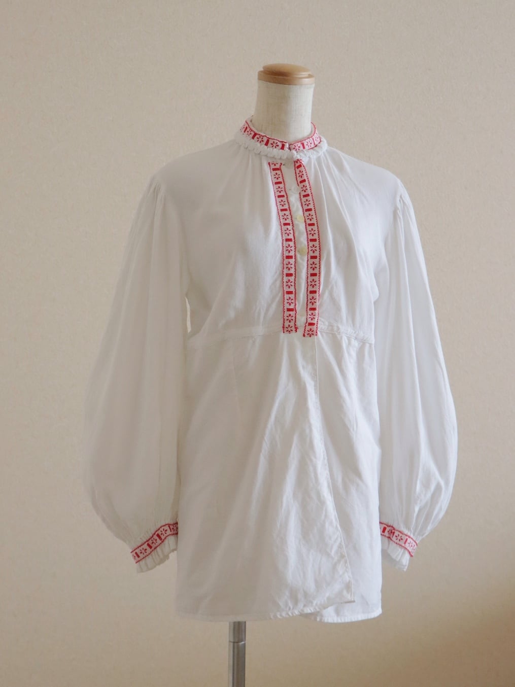 ●red color tyrolean embroidery design puff sleeve blouse.