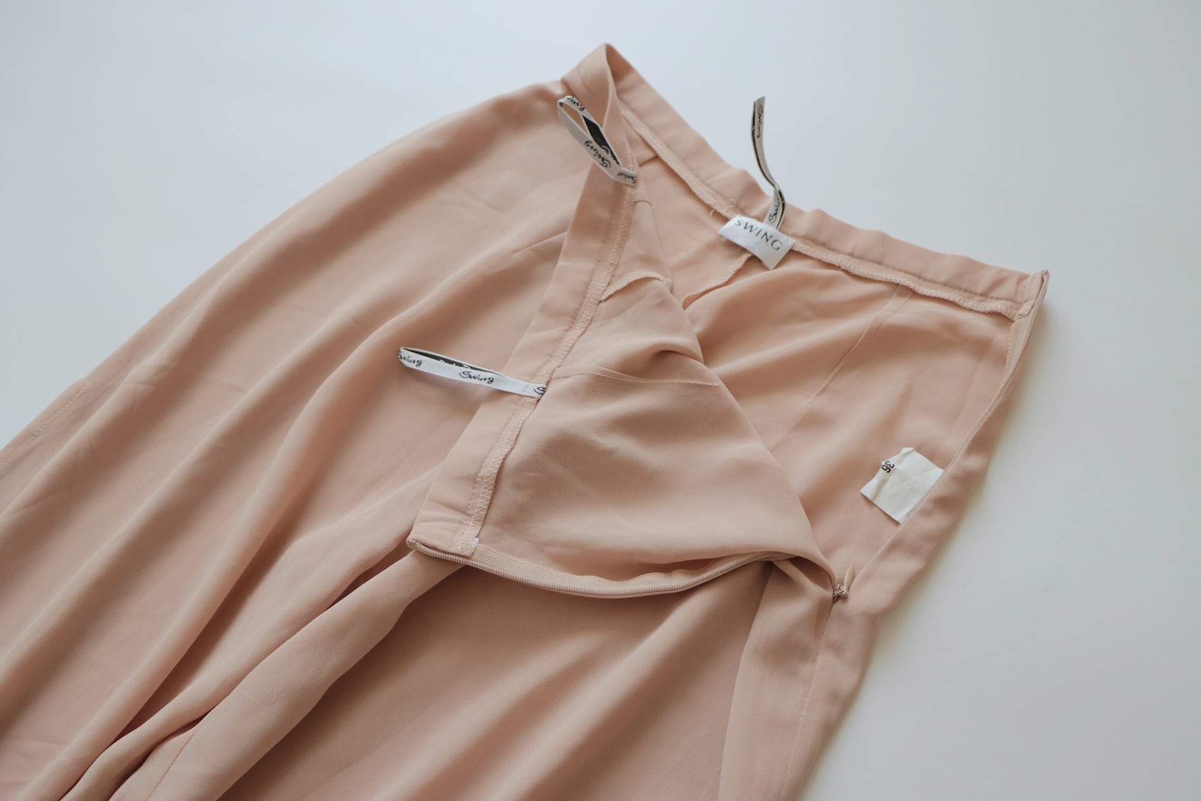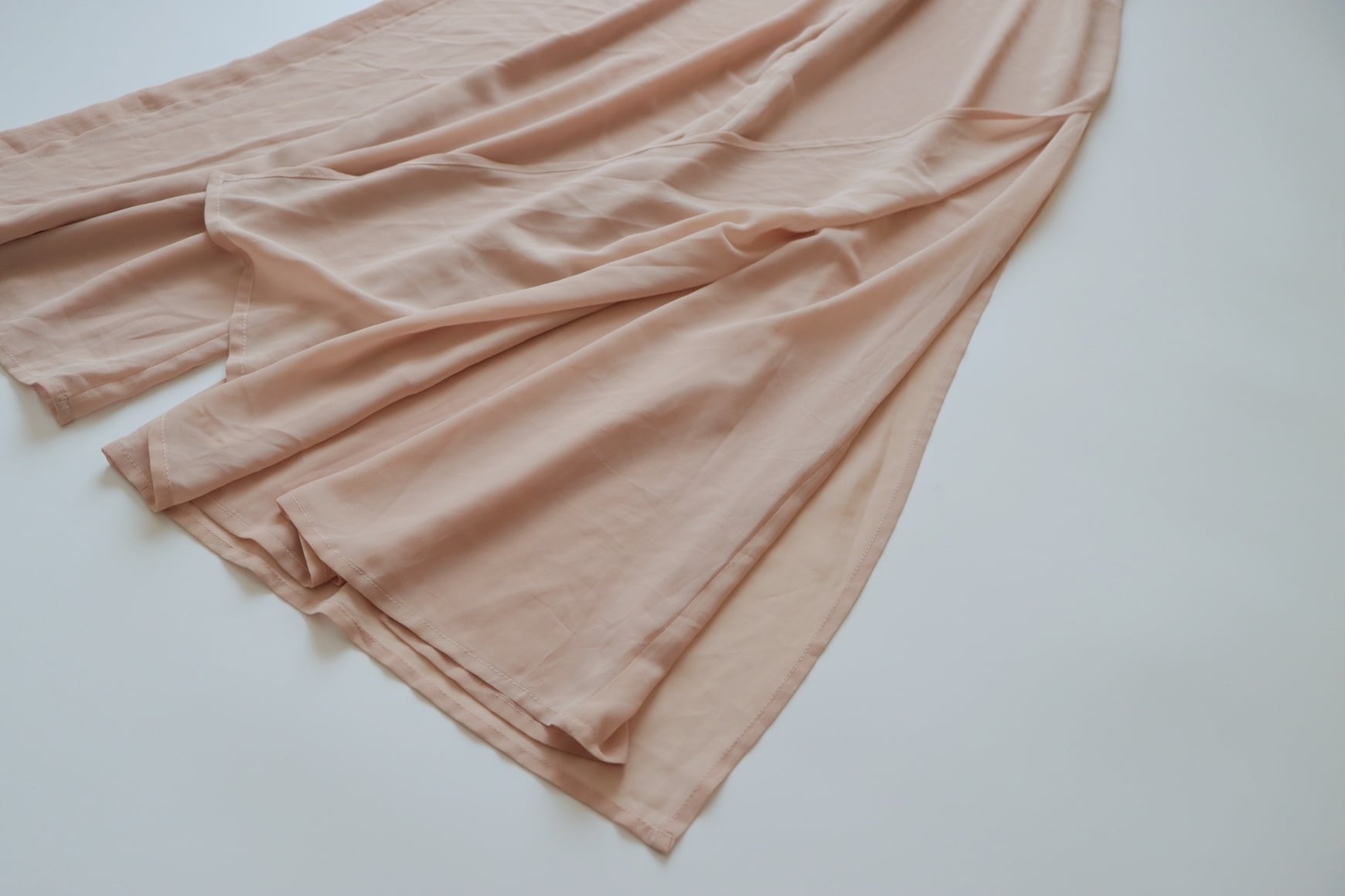 同生地を2枚重ねたデザインで、両サイドには上生地のみスリットが入っているので、歩くとふんわり空気を含み、絶妙な立体感と動きを出してくれます◎