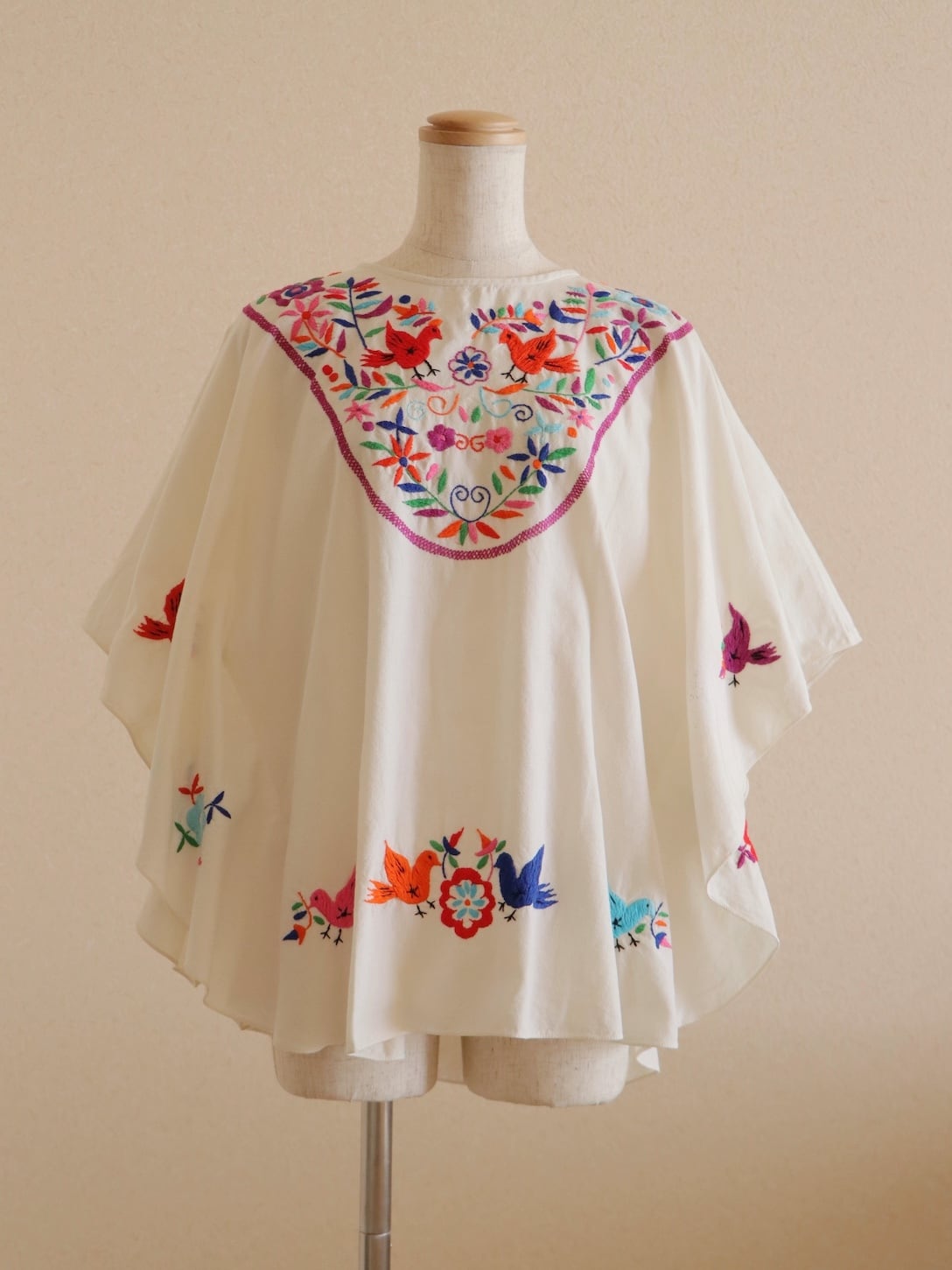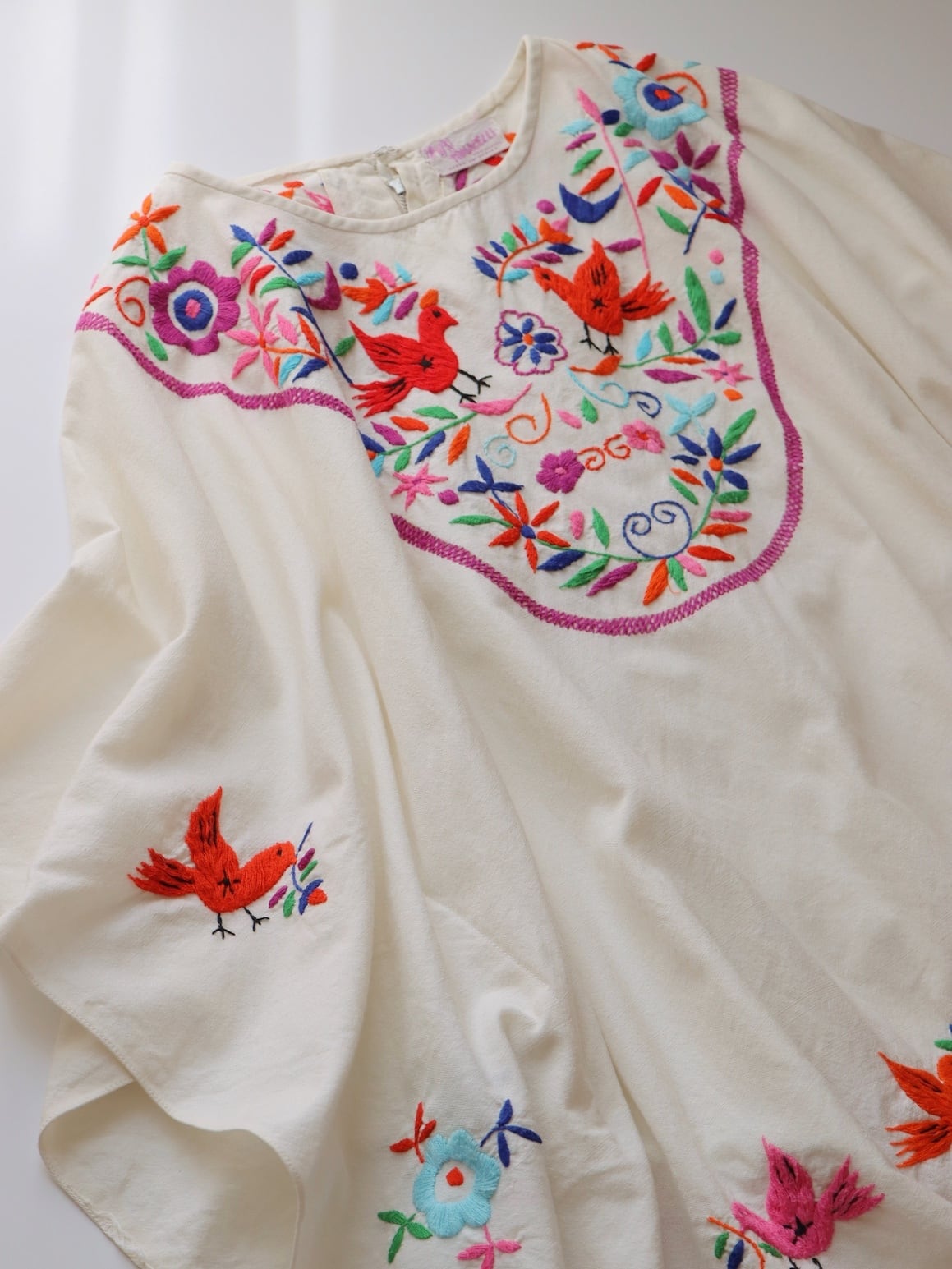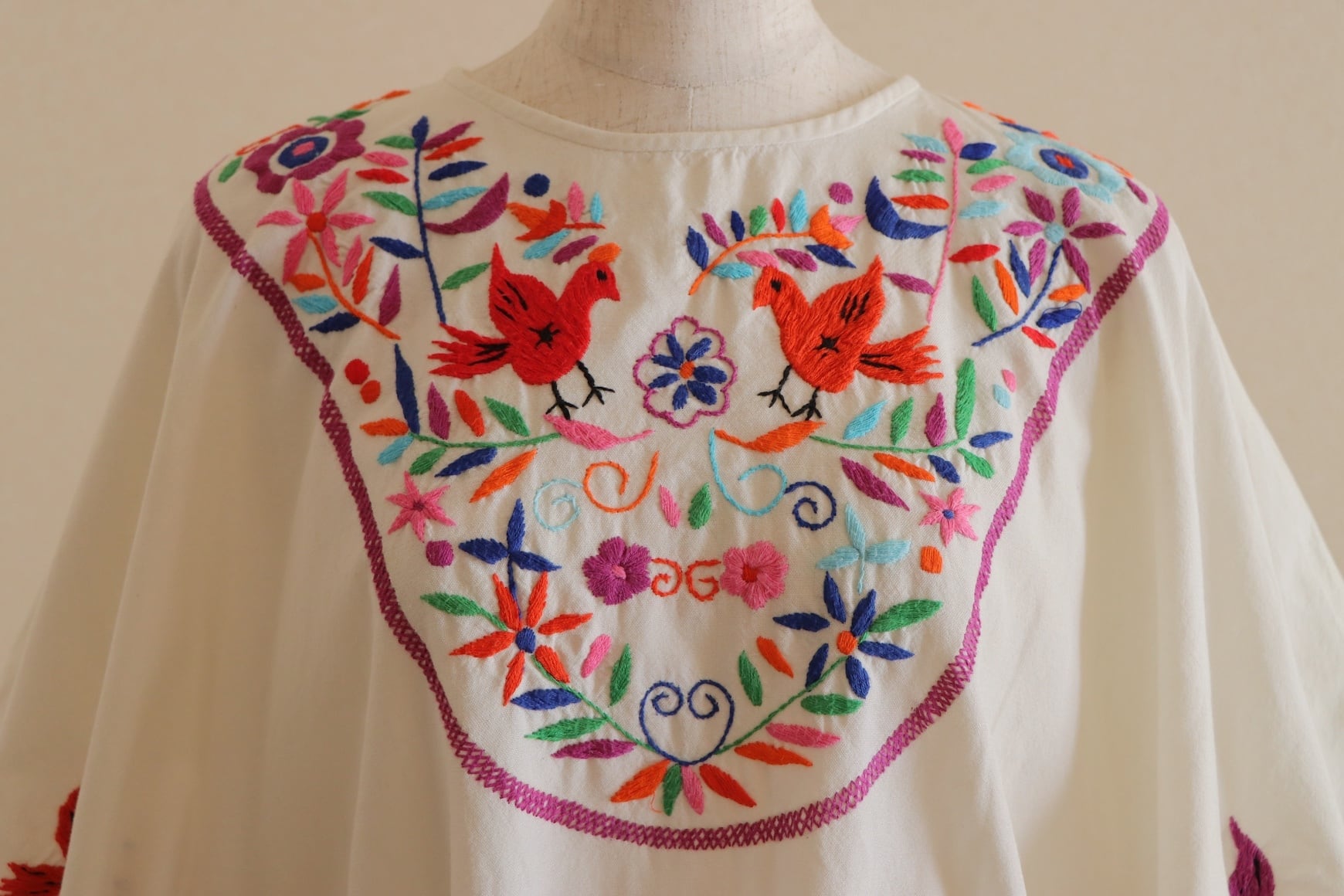 メキシコのサンアントニーノで伝統的に作られている刺繍のスタイルで、小鳥や花を多色使いで立体的に表現した、豪華さ溢れる非常に手間のかかったお品です。