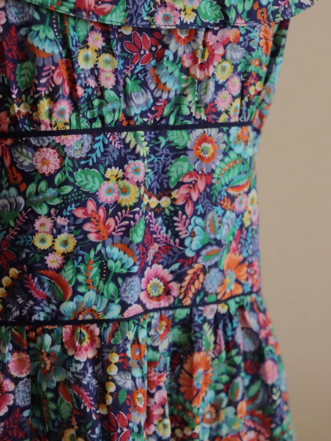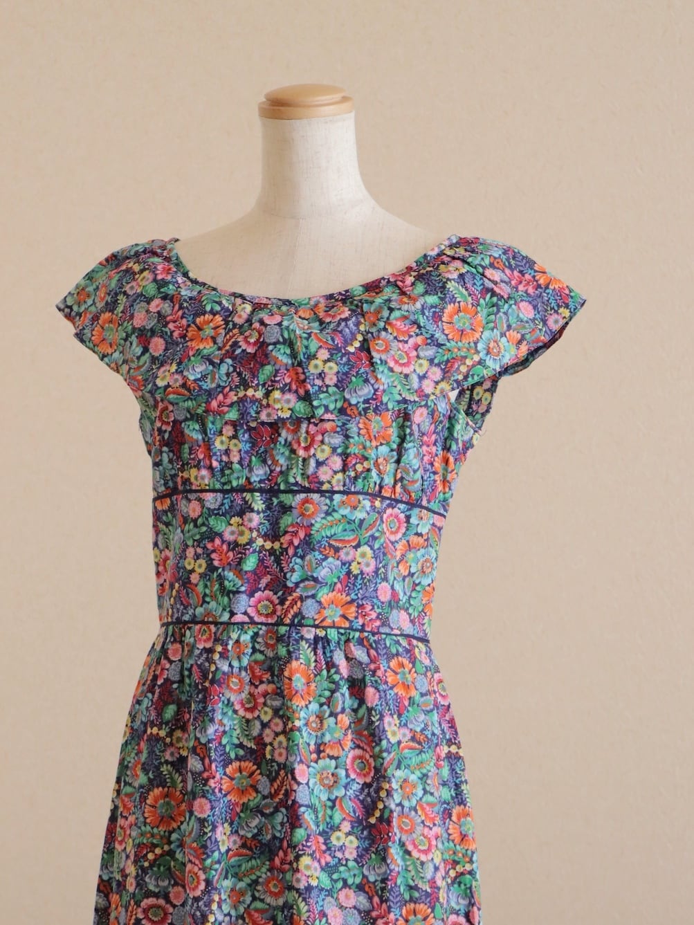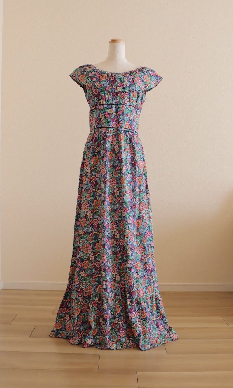 鮮やかな配色で表現した水彩画のような花柄が目を惹く、70年代頃のフランスのブランドのマキシドレス。