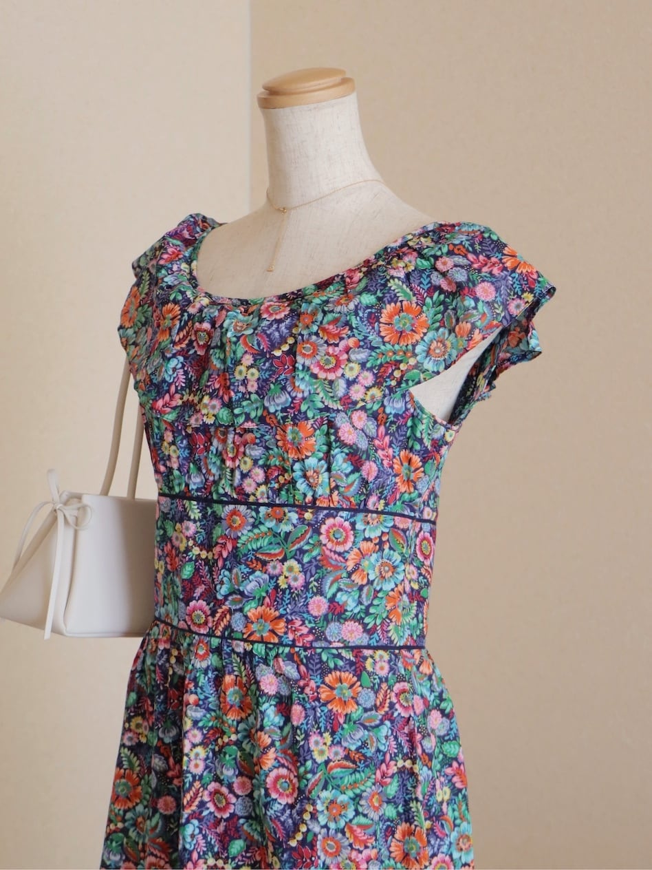 深みのあるネイビーをベースにした多色使いのボタニカル柄が、サイケデリックかつナチュラルで大人な雰囲気を感じさせてくれます。