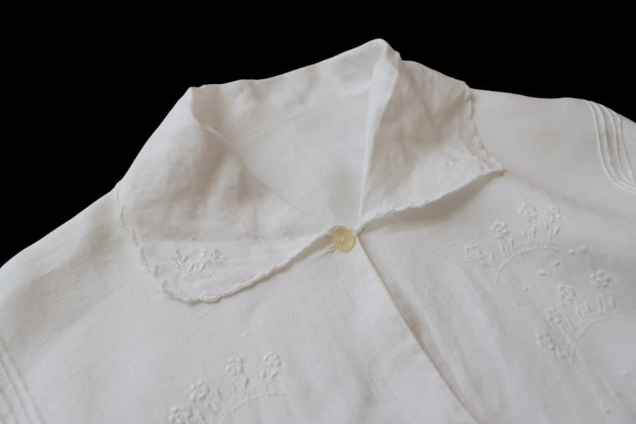 繊細に施された胸元のフラワー刺繍や襟端のカットワークなど、控えめながらも上品で高級感を出した1着です。
