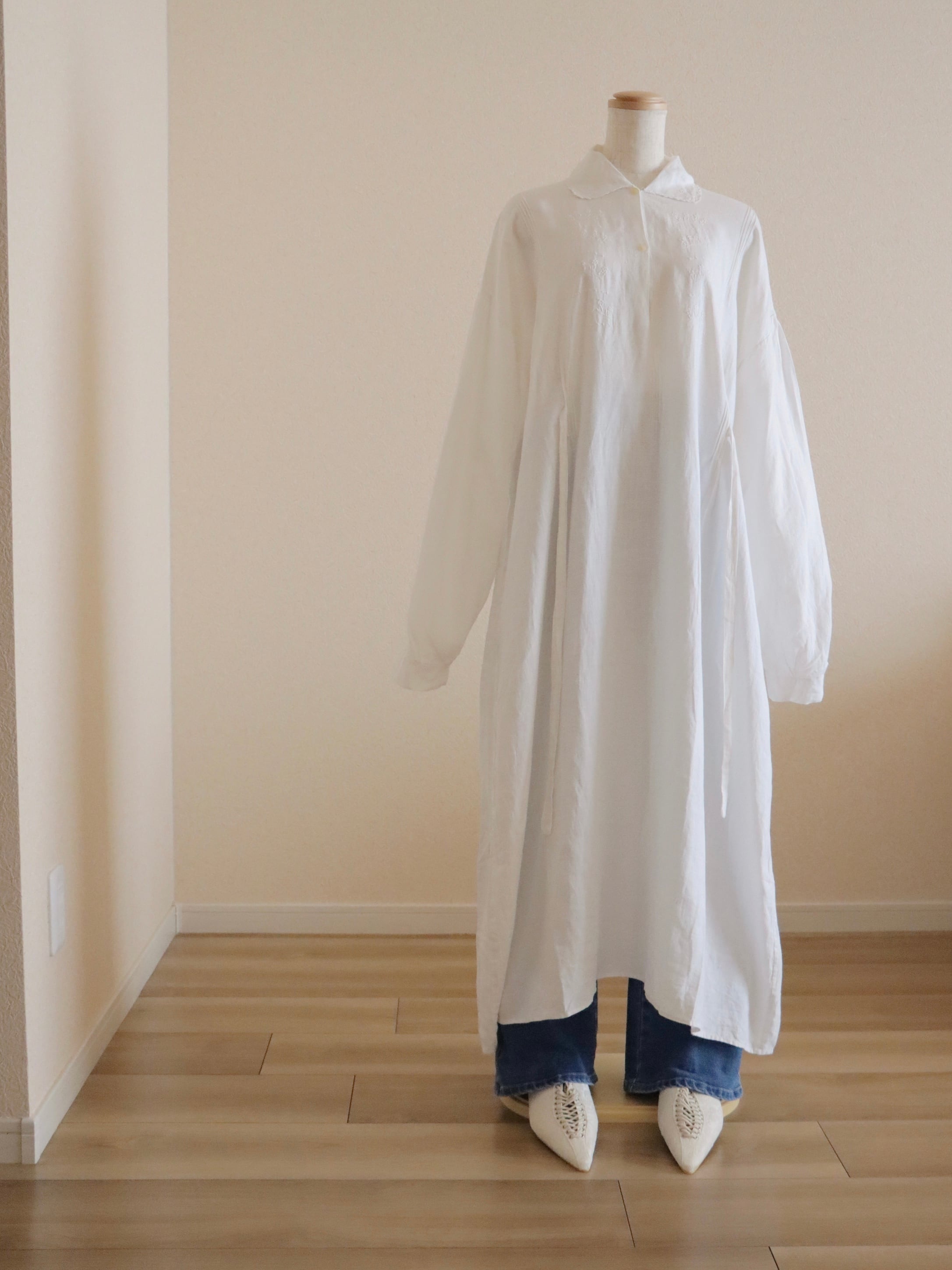 ●1940-50s French vintage embroidery & tuck detail long shirt dress.