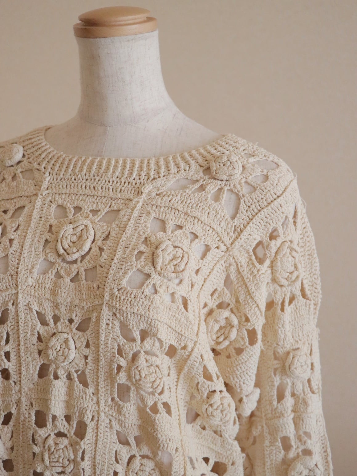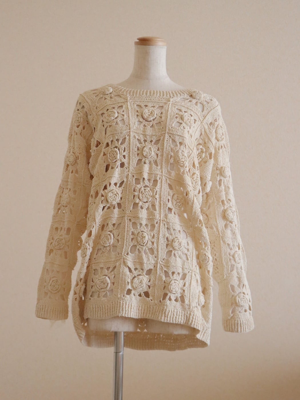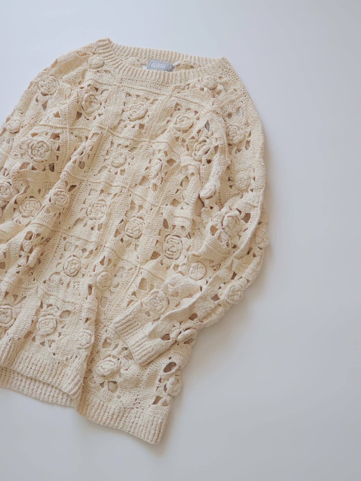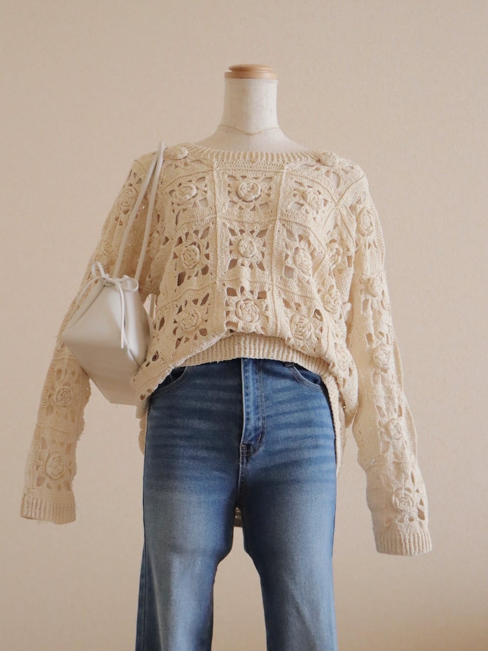 まるで手編みのように表現された立体感のあるお花のかぎ針編みと、程よいルーズさが可愛い、これからの季節にお勧めの1着です。