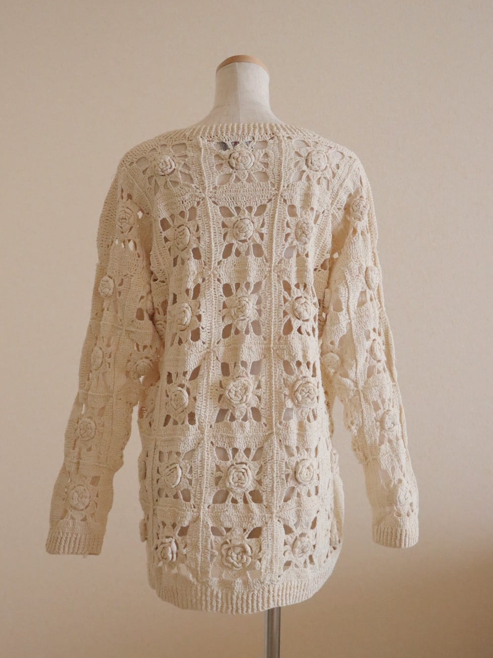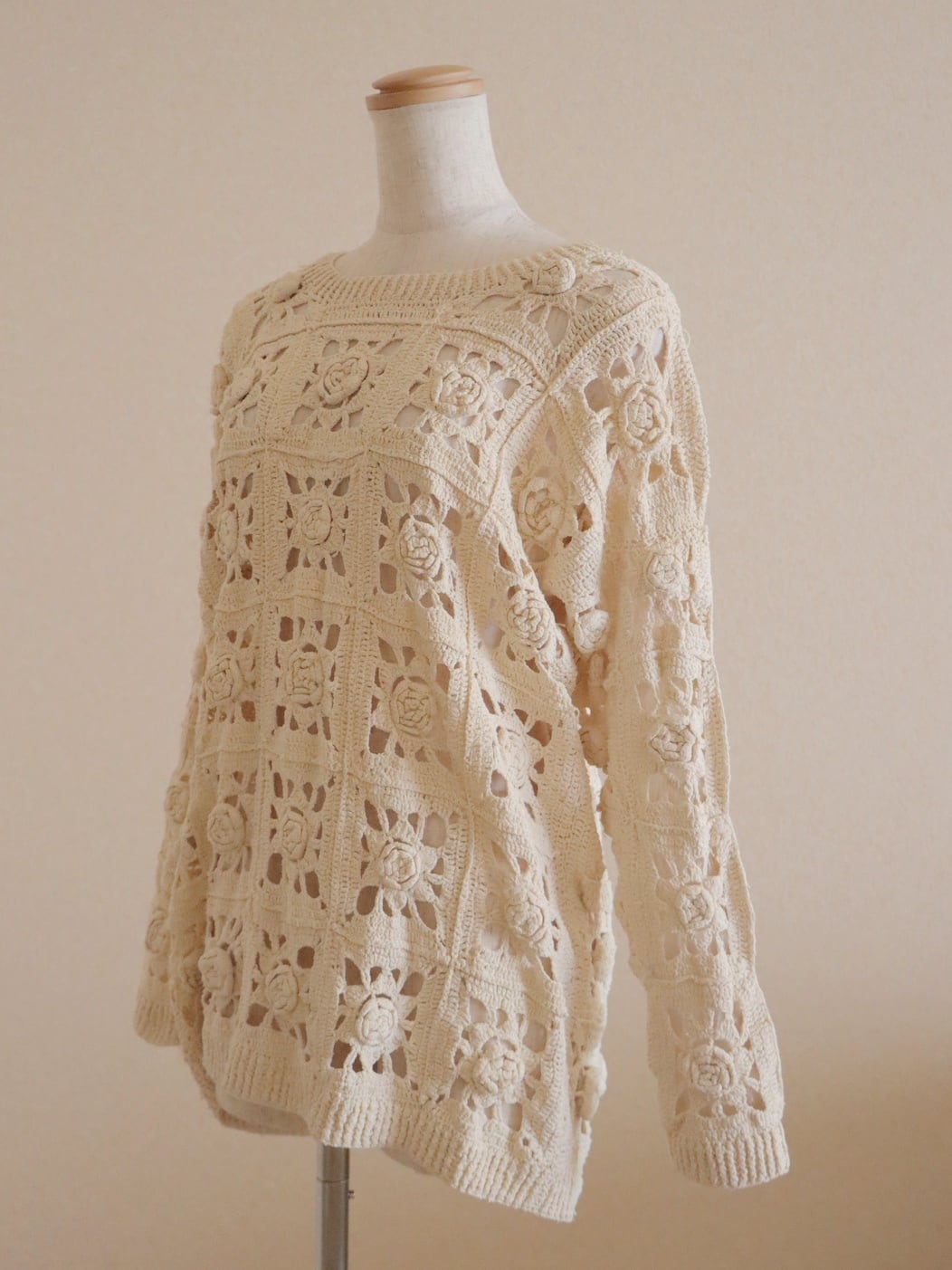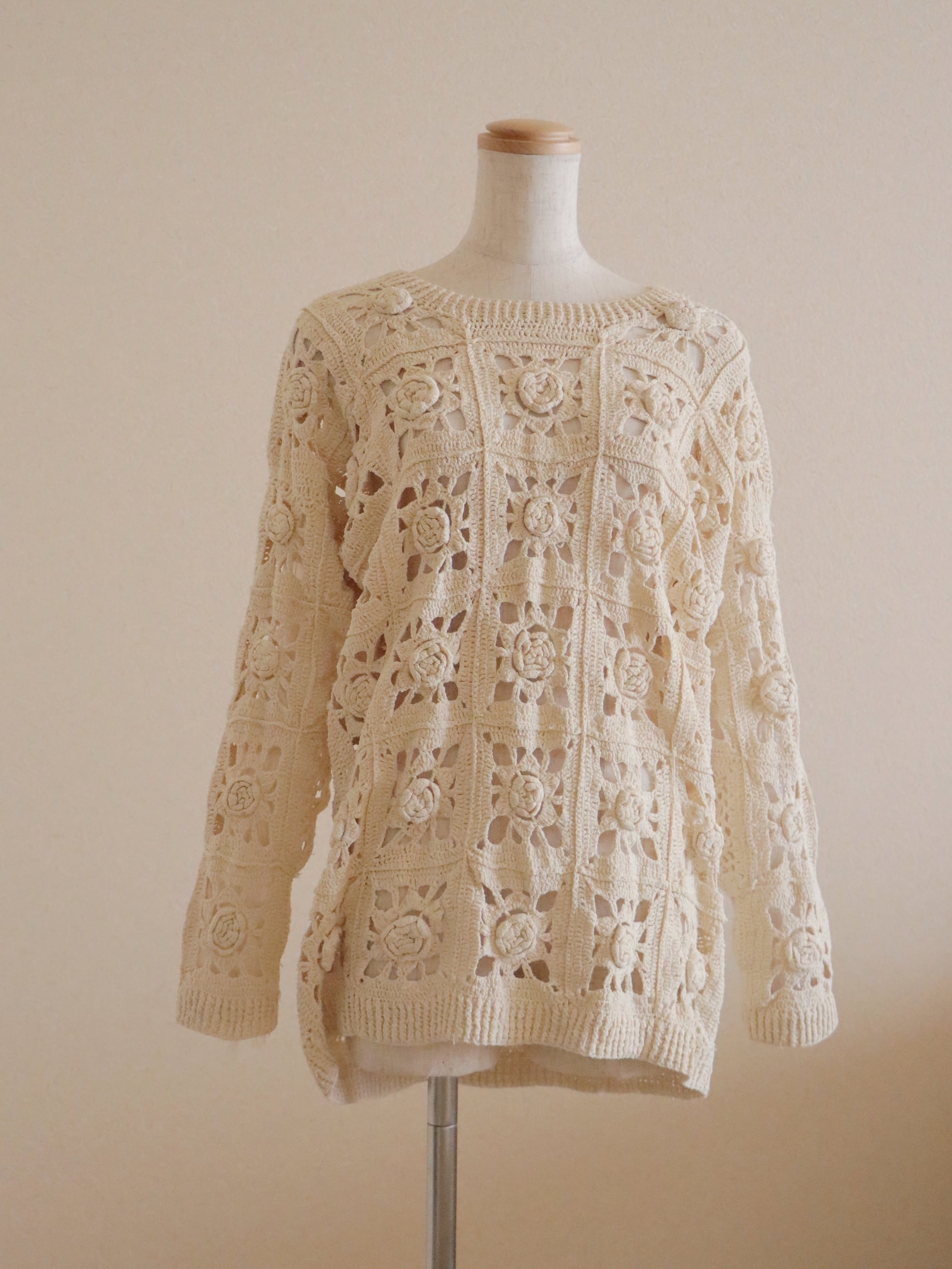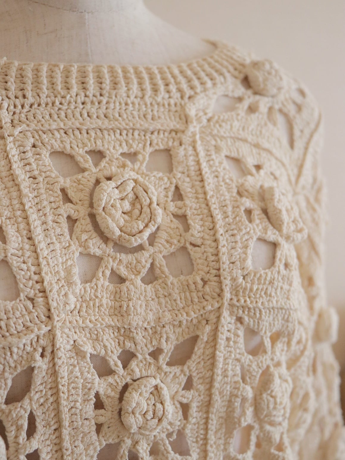 まるで手編みのように表現された立体感のあるお花のかぎ針編みと、程よいルーズさが可愛い、これからの季節にお勧めの1着です。