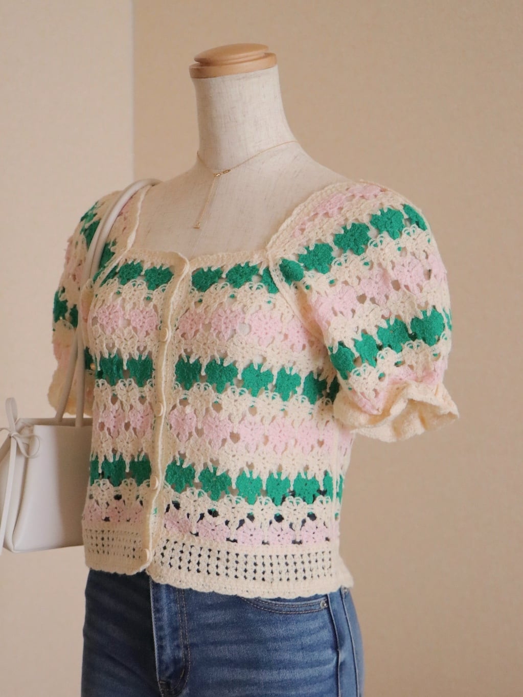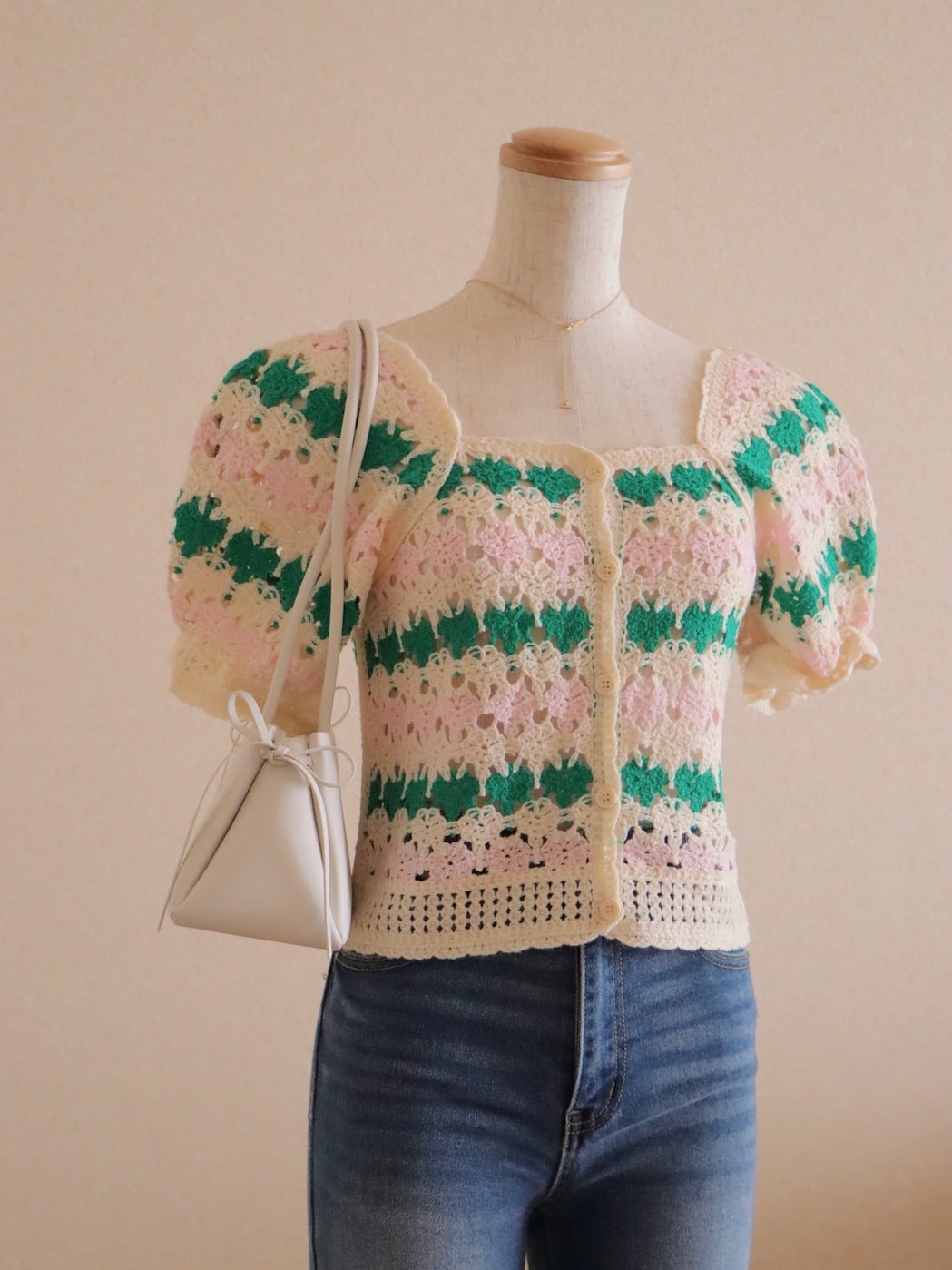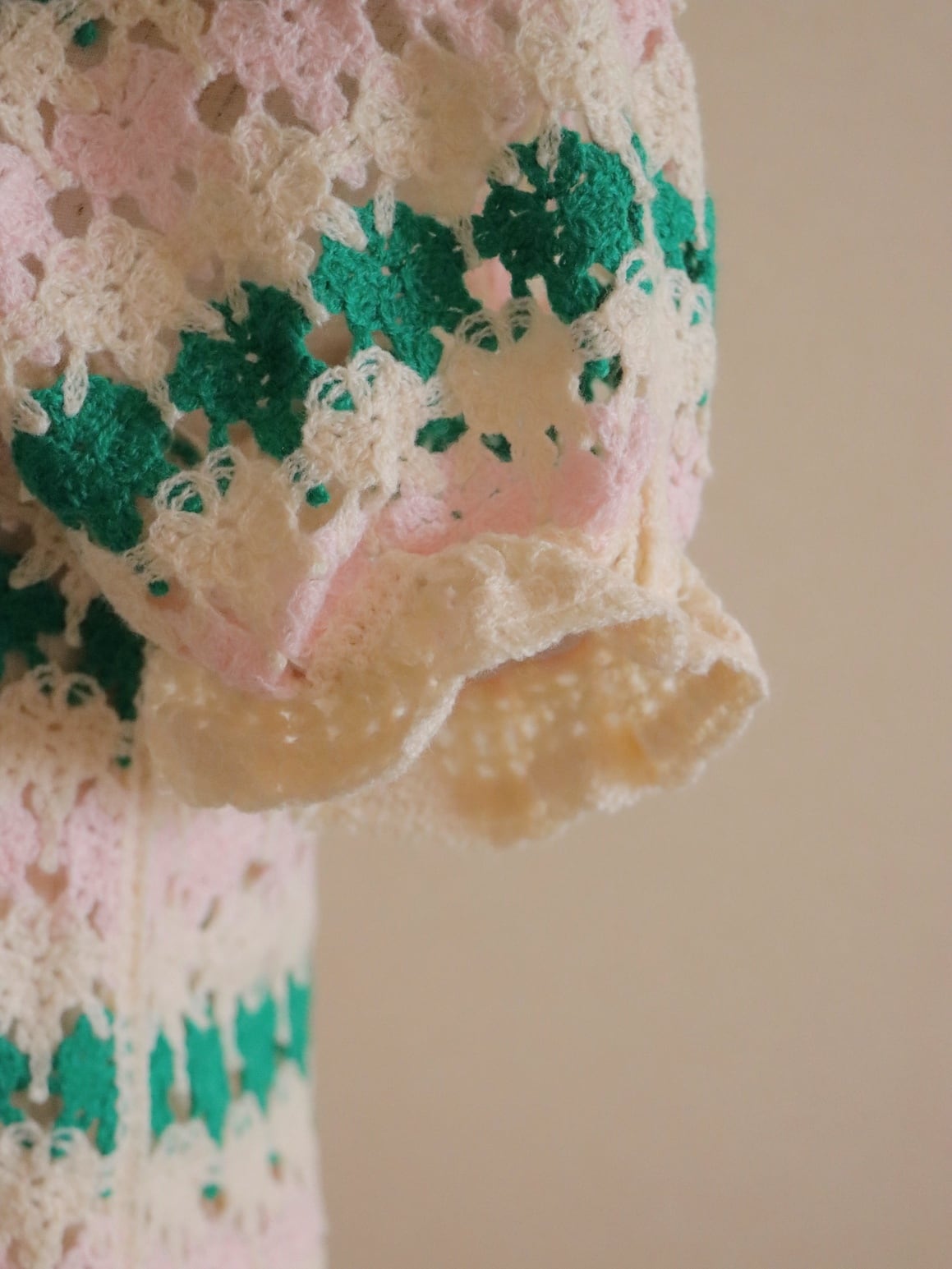 淡く優しい配色が目を惹くクロシェデザイントップス。