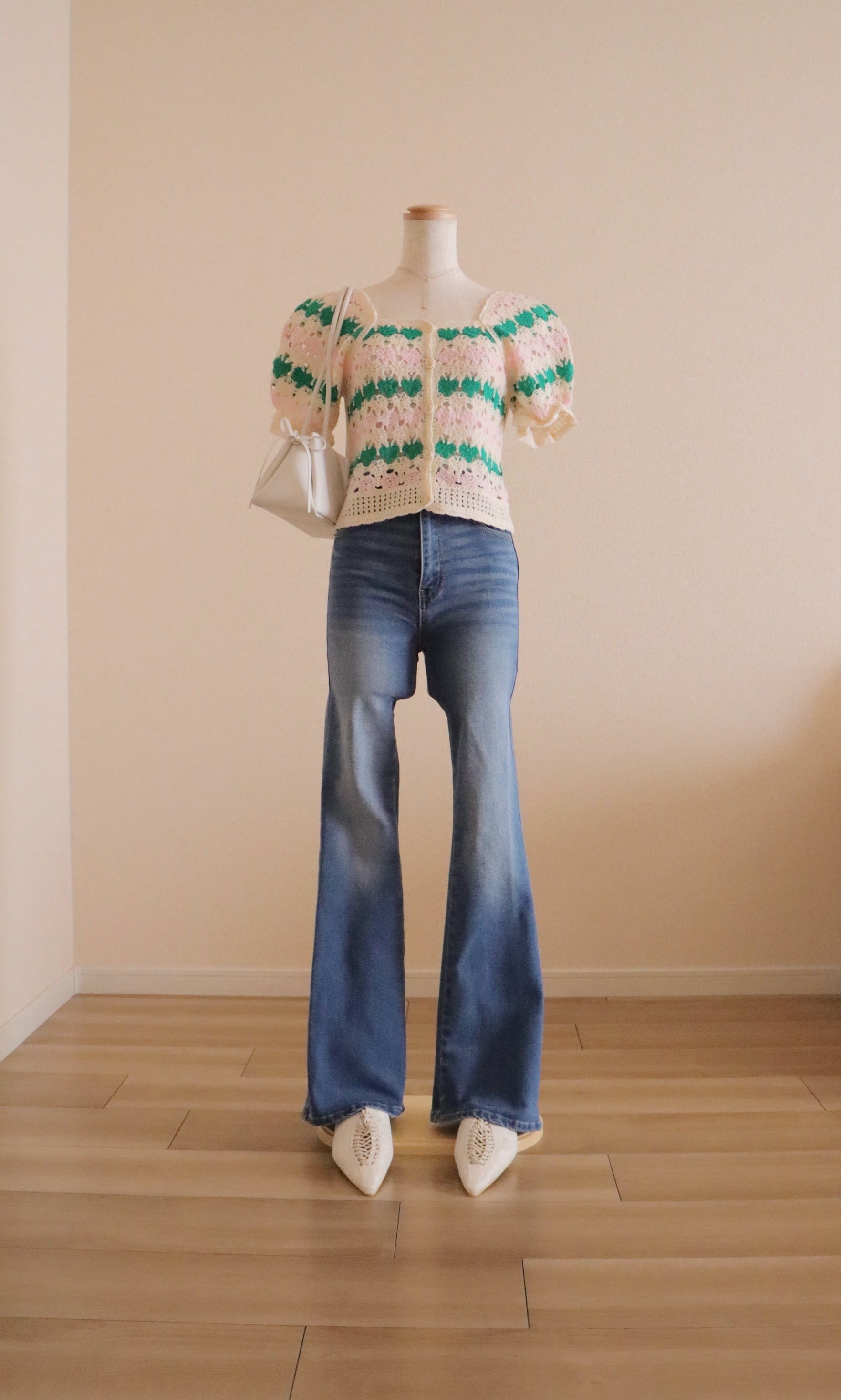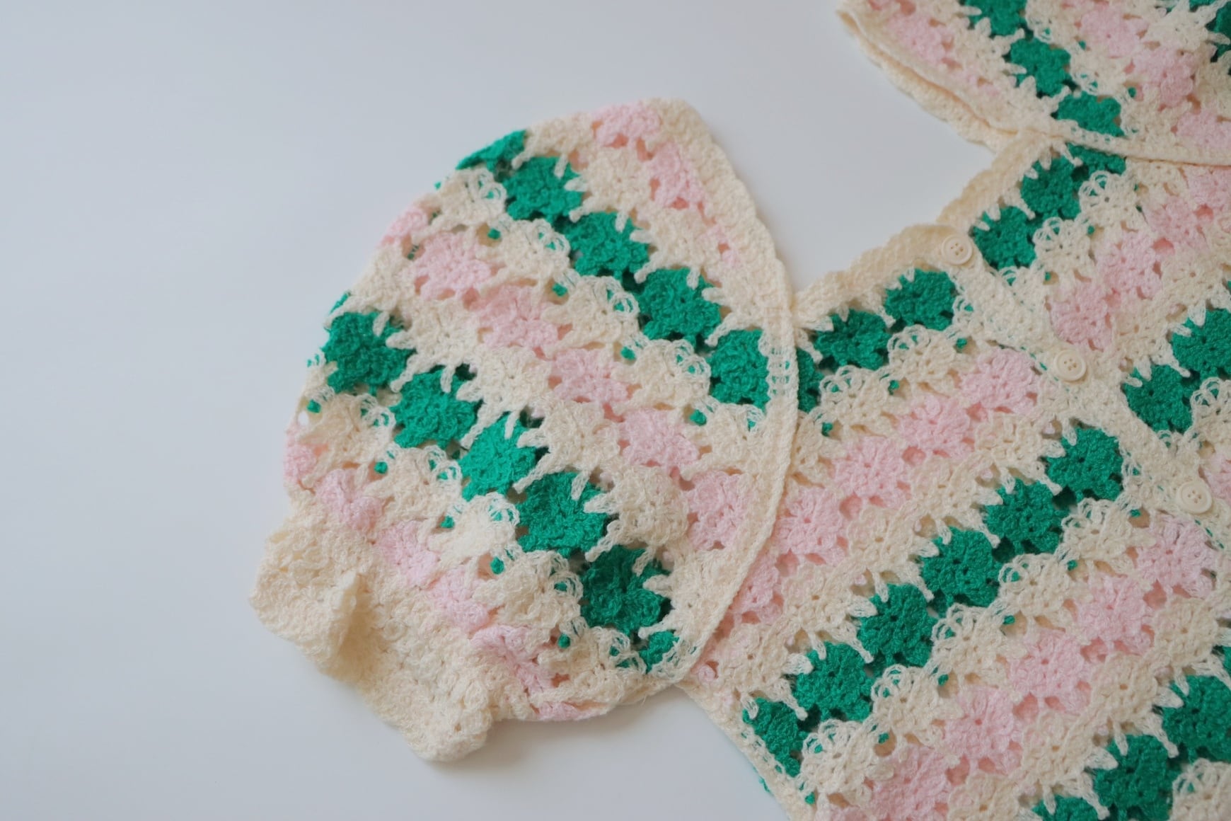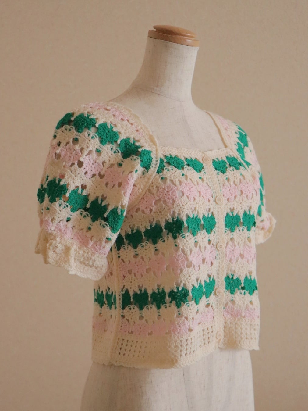 淡く優しい配色が目を惹くクロシェデザイントップス。