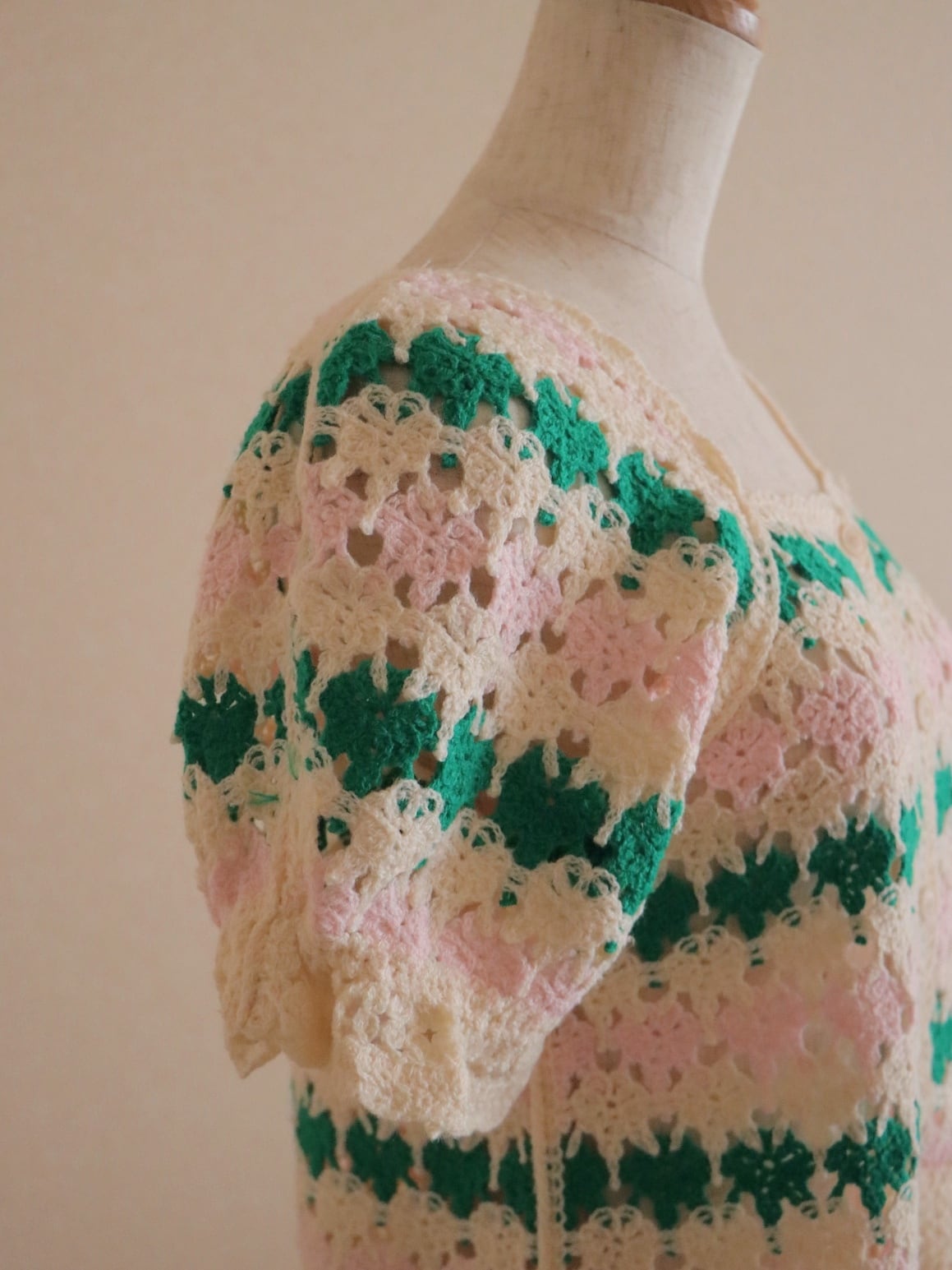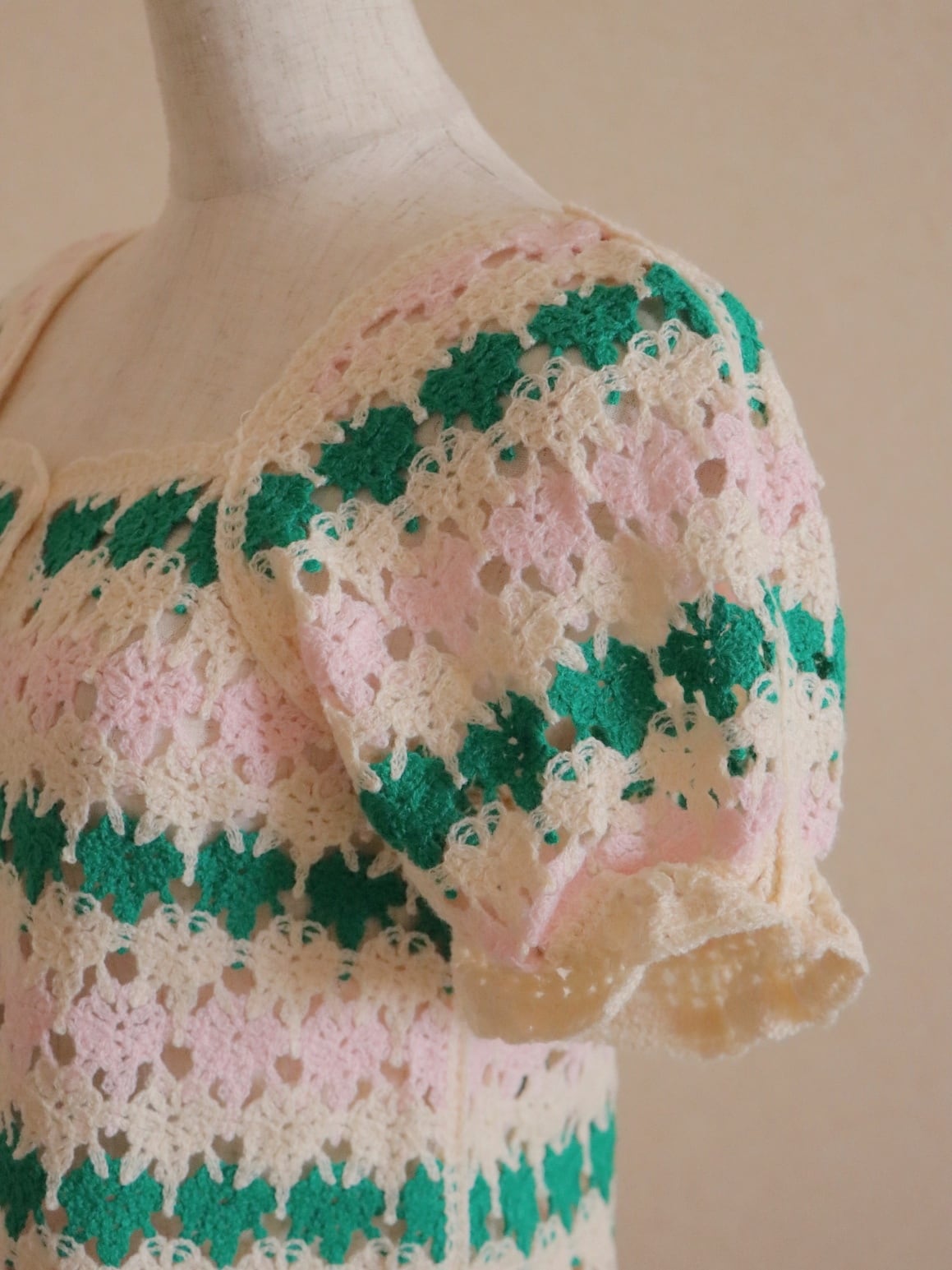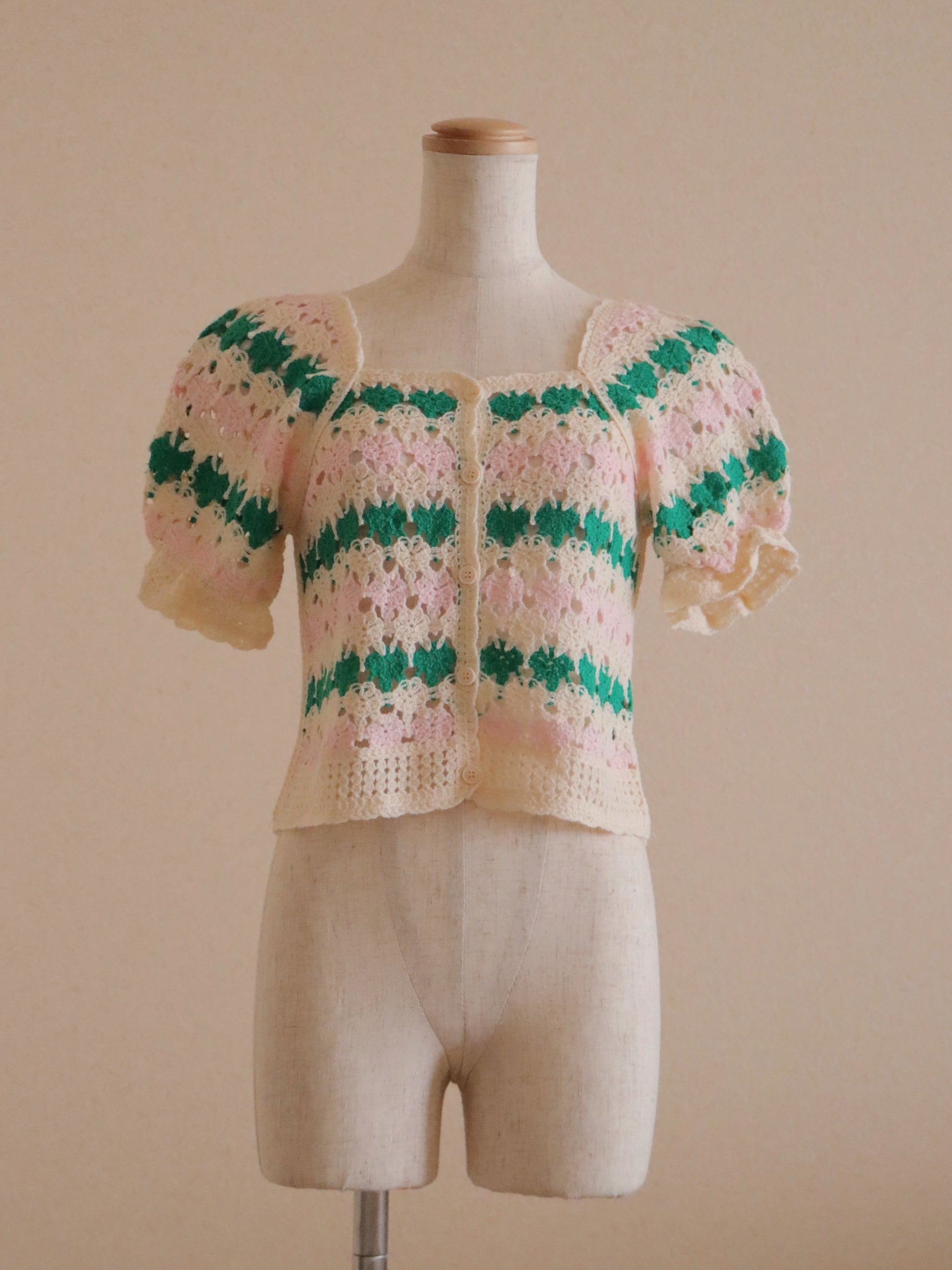 ●pink & ivory & green color embroidery crochet design knitted top.