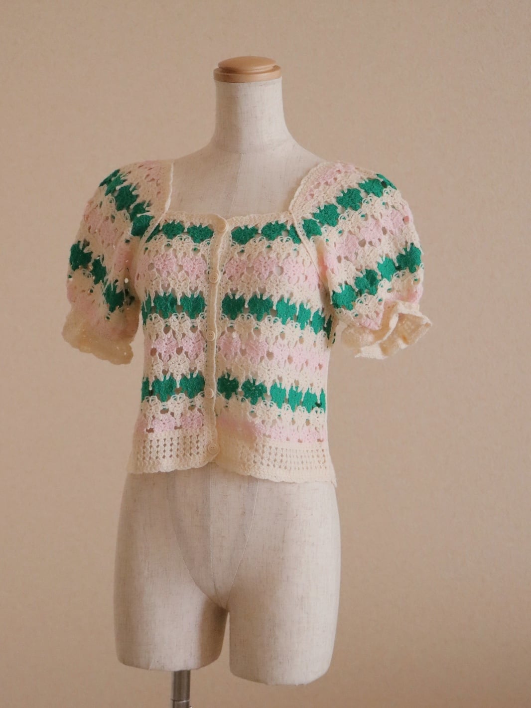 繊細に編まれたかぎ針編みの柔らかな風合いと優しい色味、ふんわりとした立体感のあるパフスリーブに、すっきりとした身頃のシルエットの絶妙なバランスが、女性らしく綺麗なフォルムと上品な雰囲気を出してくれる1着です。