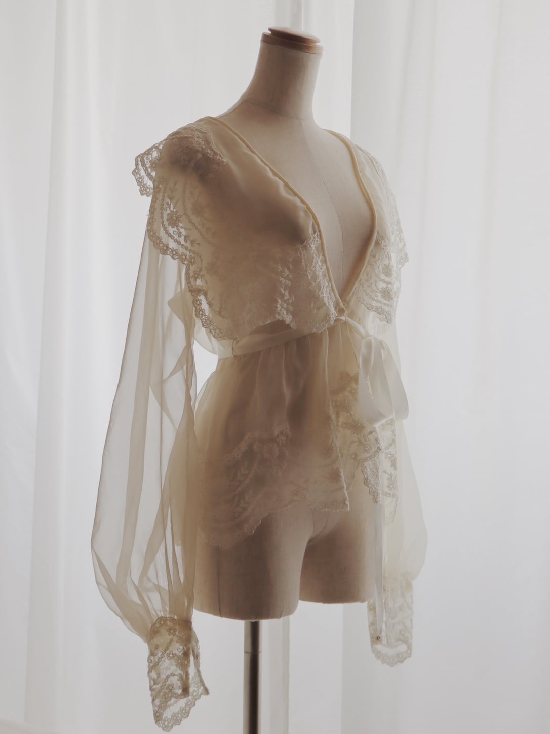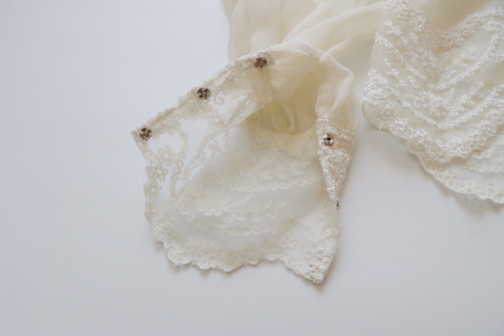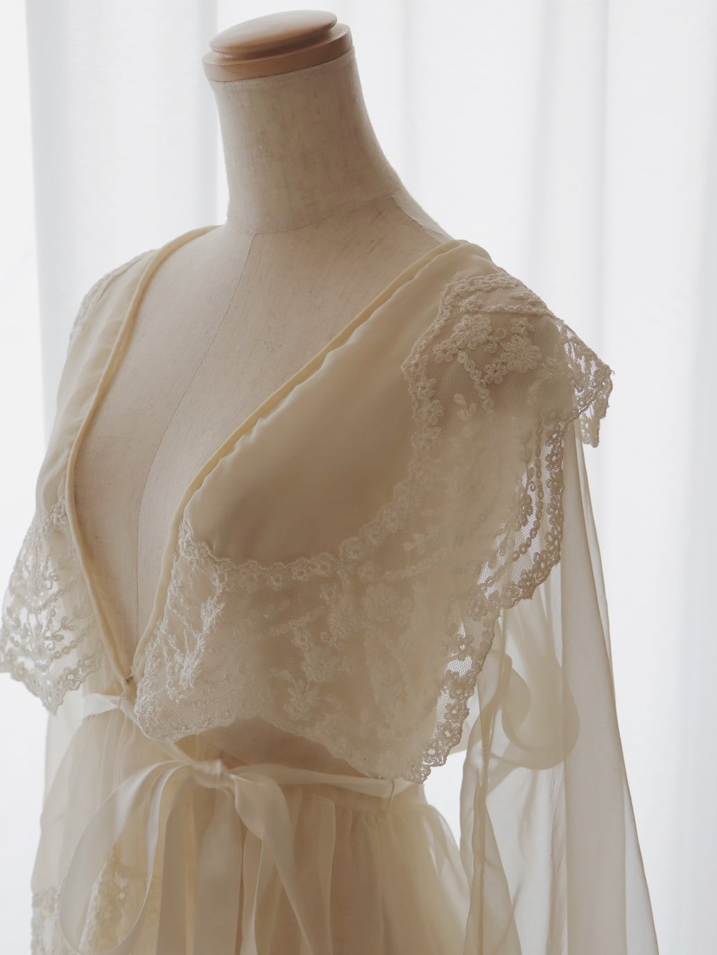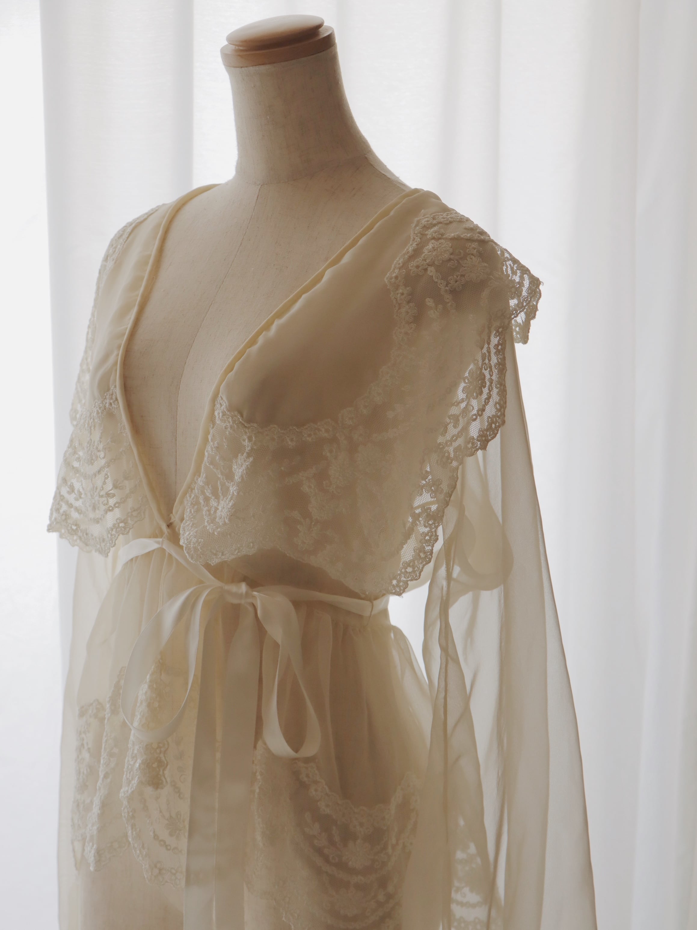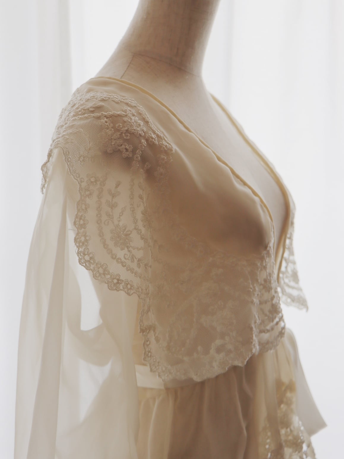 こちらは70〜80年代頃に仕立てられたお品で、ふんわりとした柔らかなシフォン生地をベースに、贅沢に施された上質な刺繍レースが目を惹く存在感のある1着です。