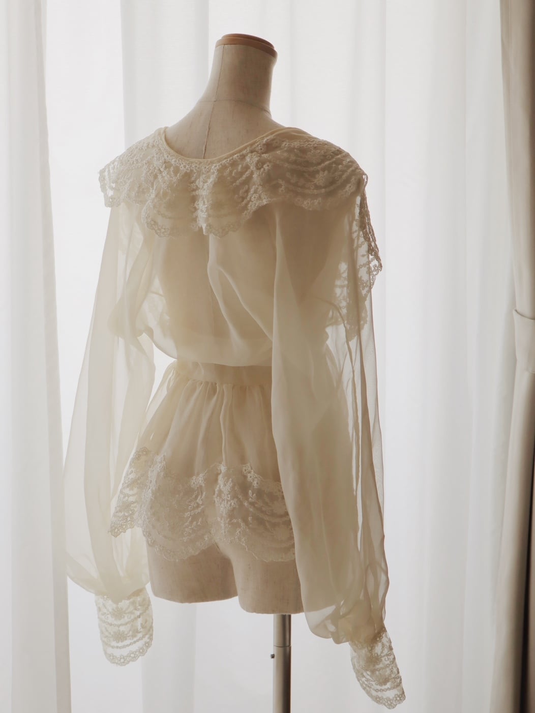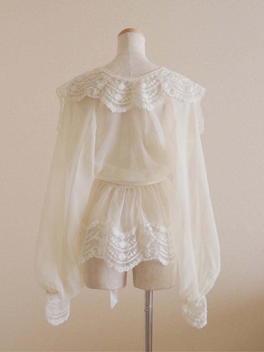 ●70-80s romantic lace embroidery collared & hem design sheer blouse