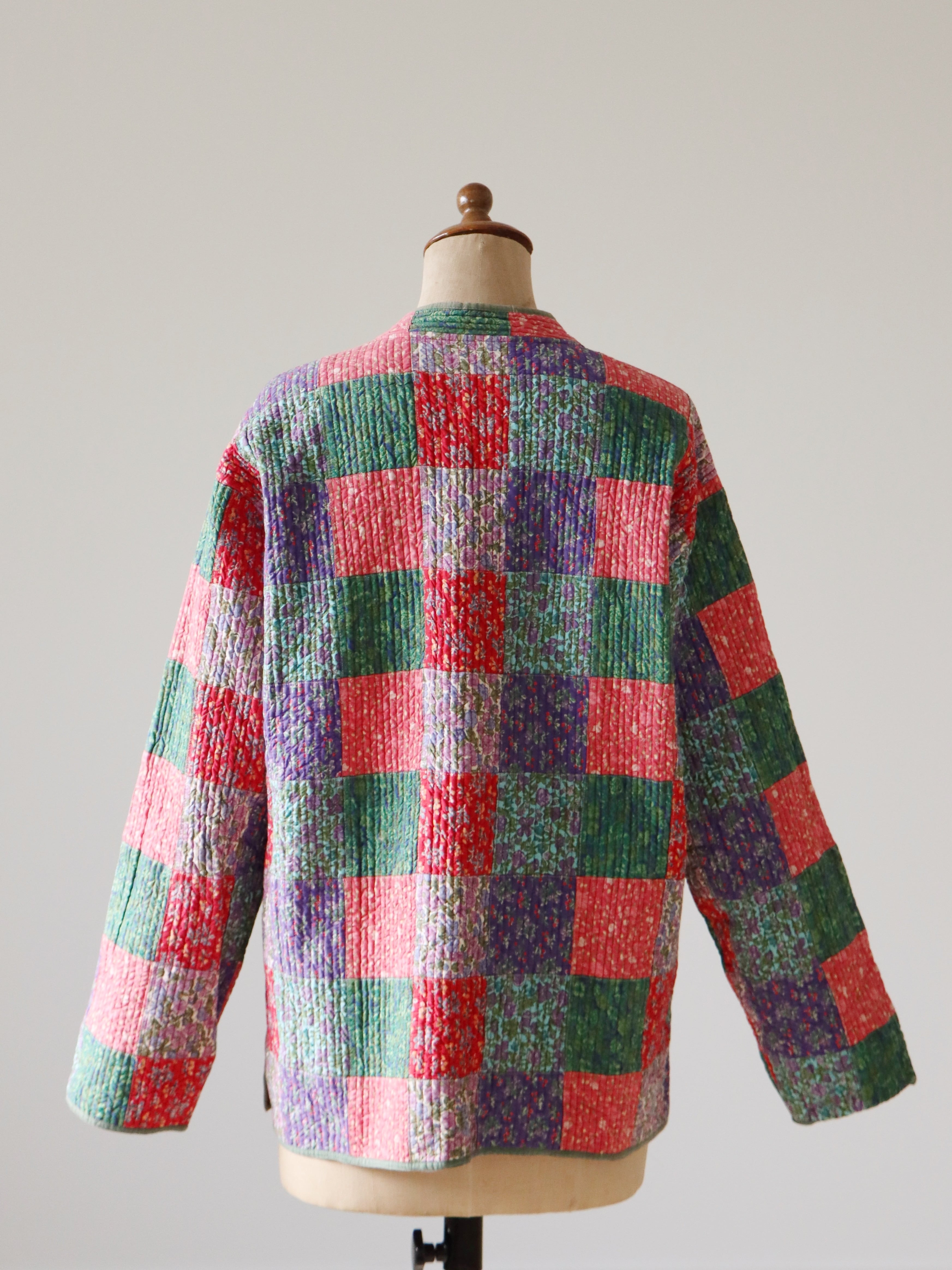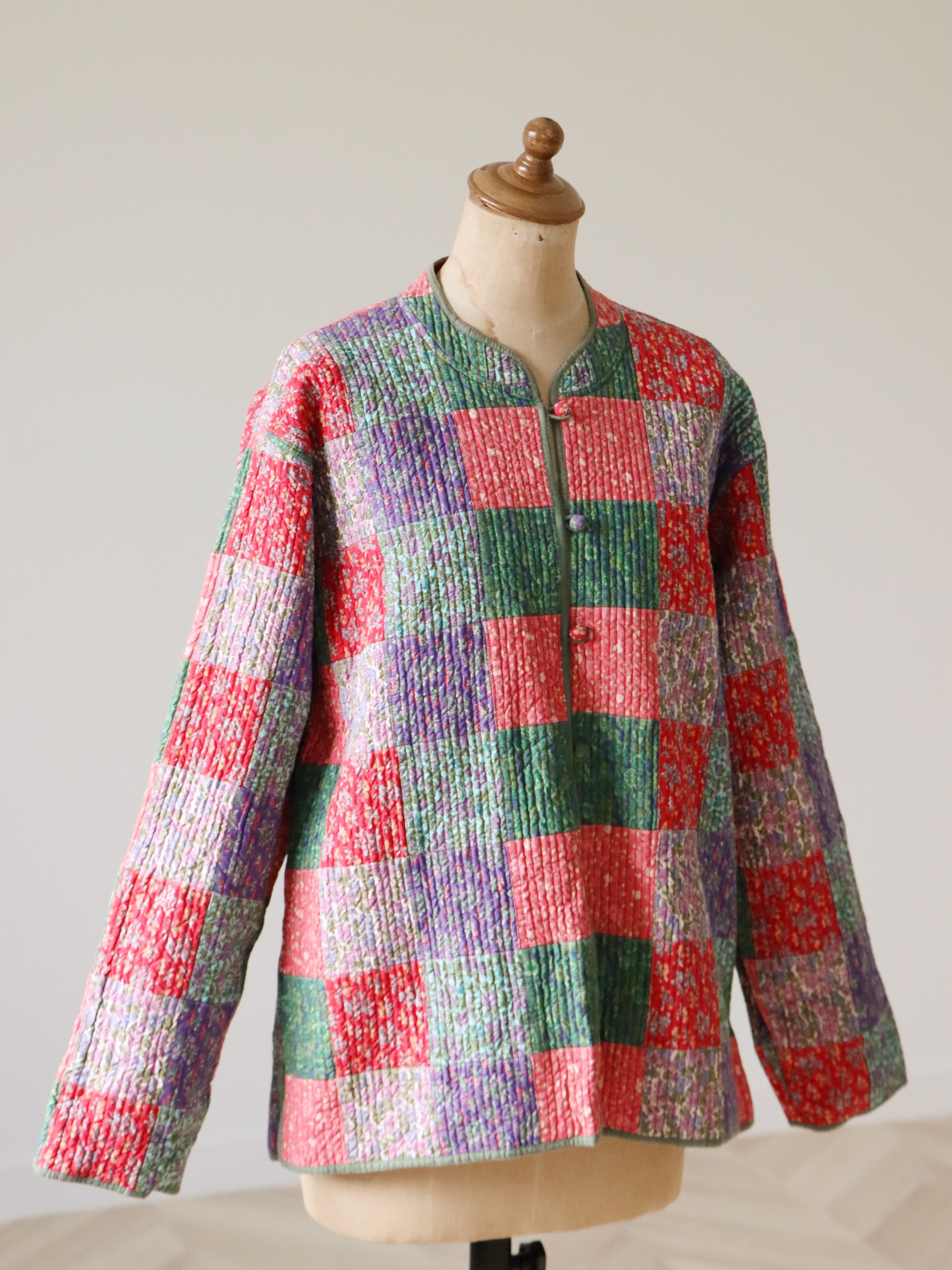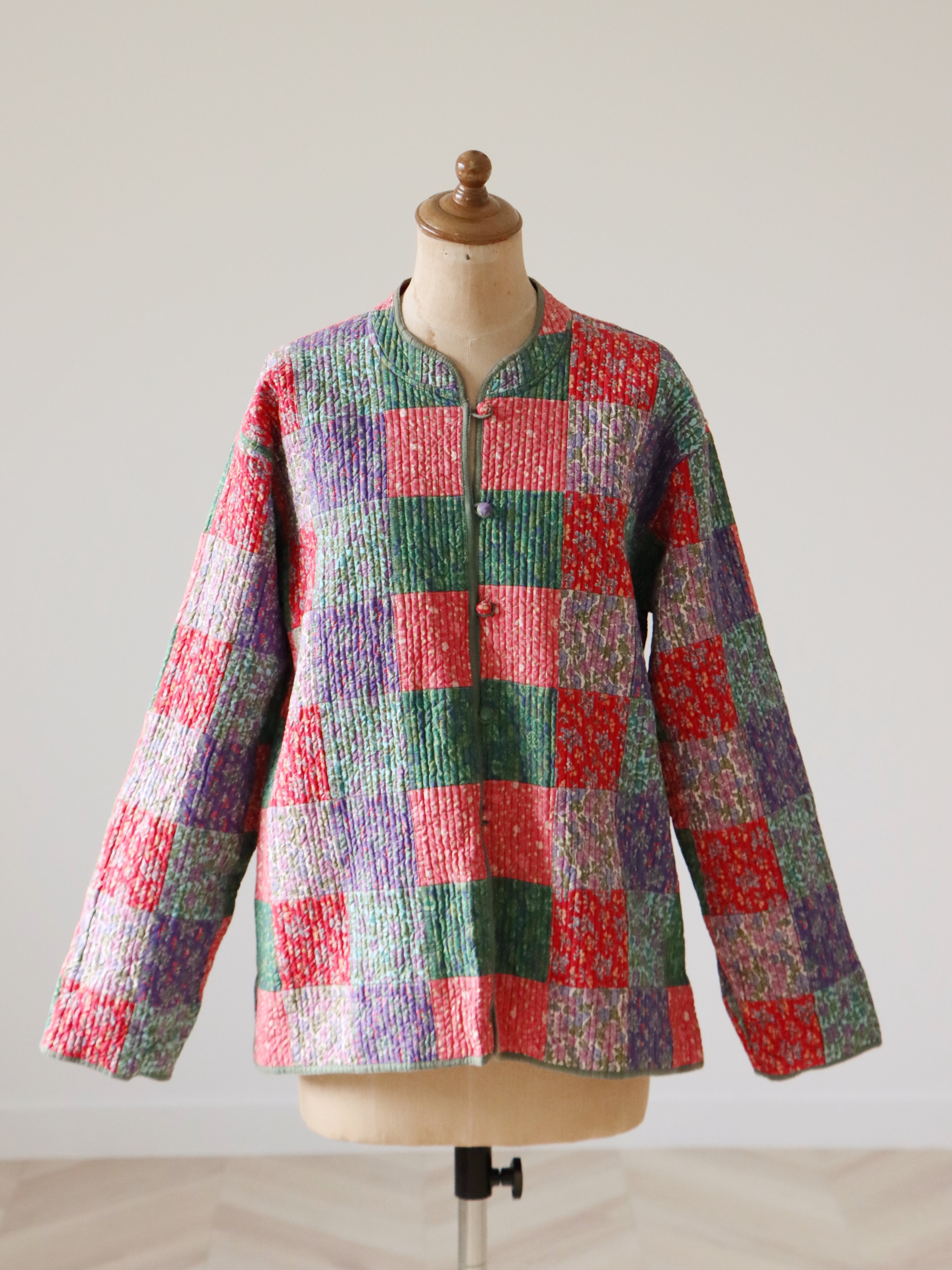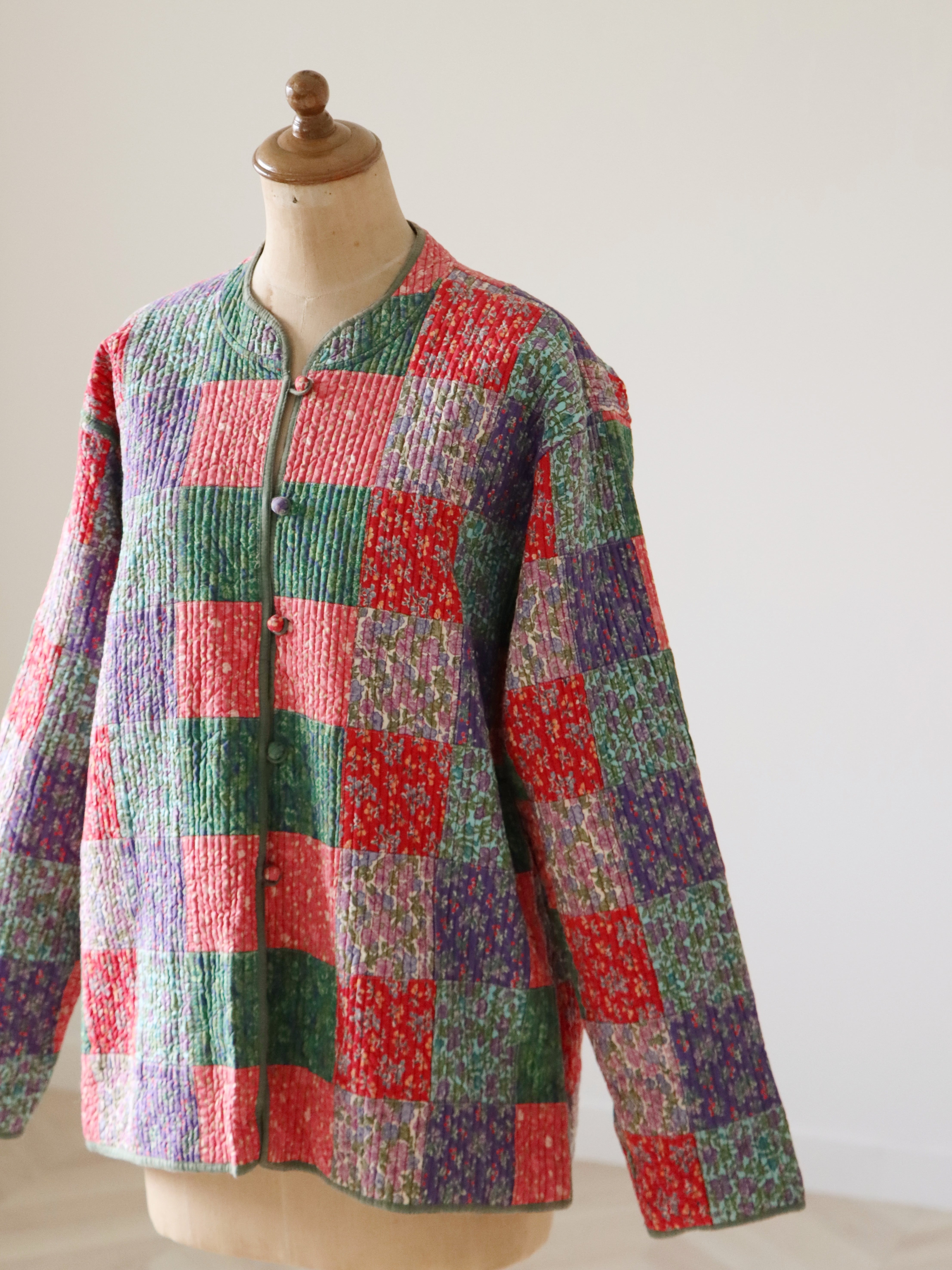 フラワーパターンの生地を贅沢にパッチワークした、70sキルティングジャケットです。