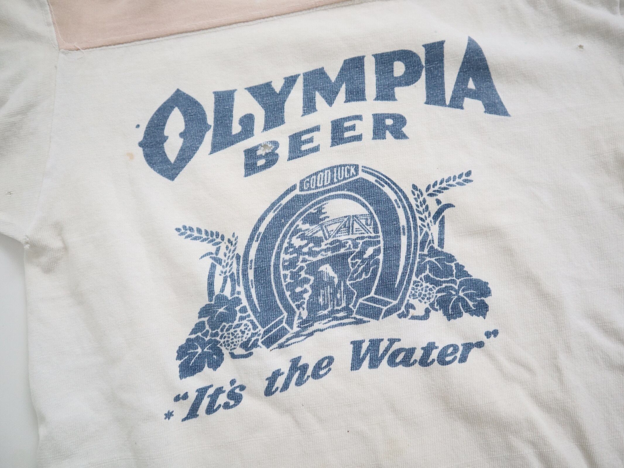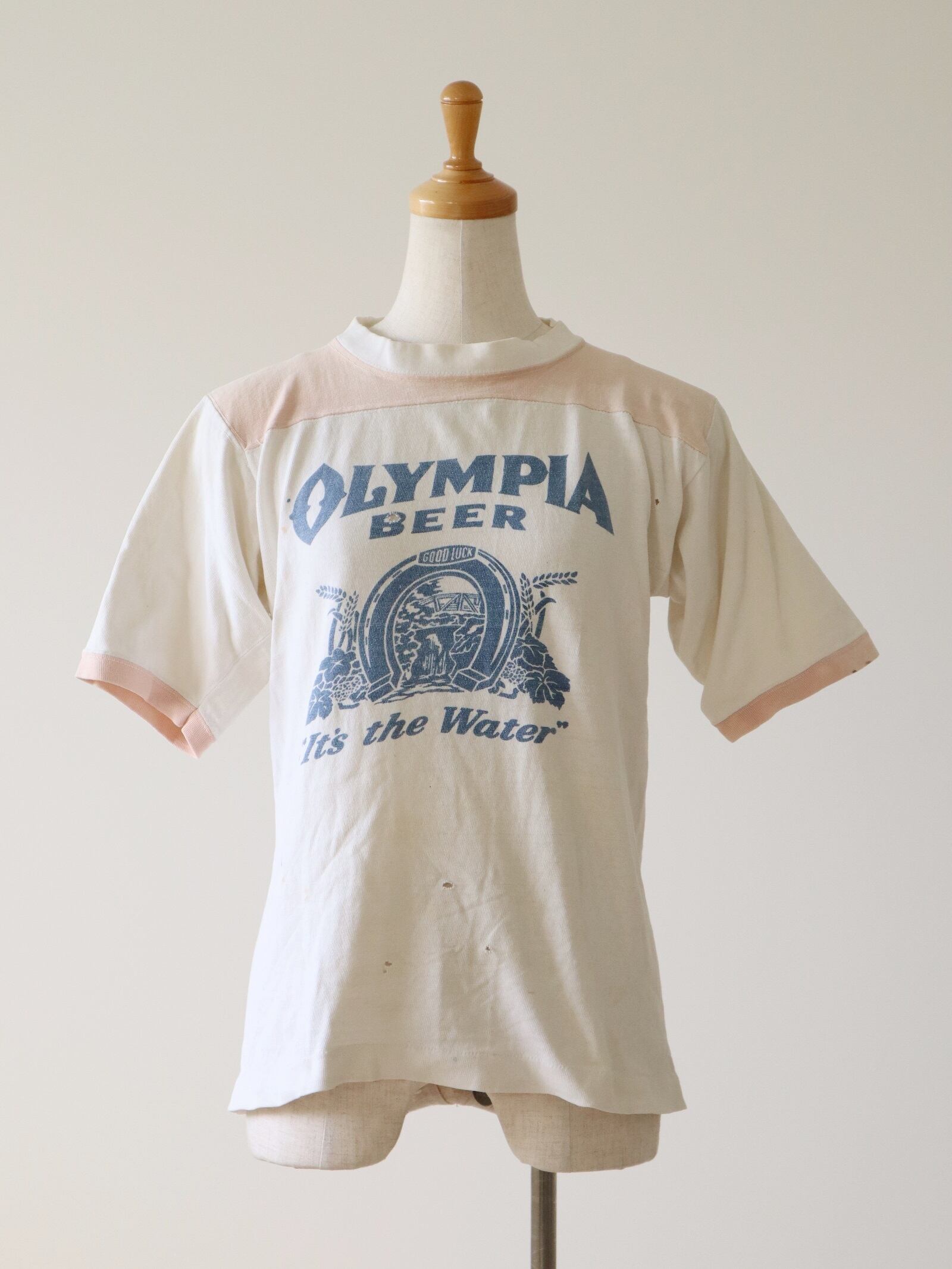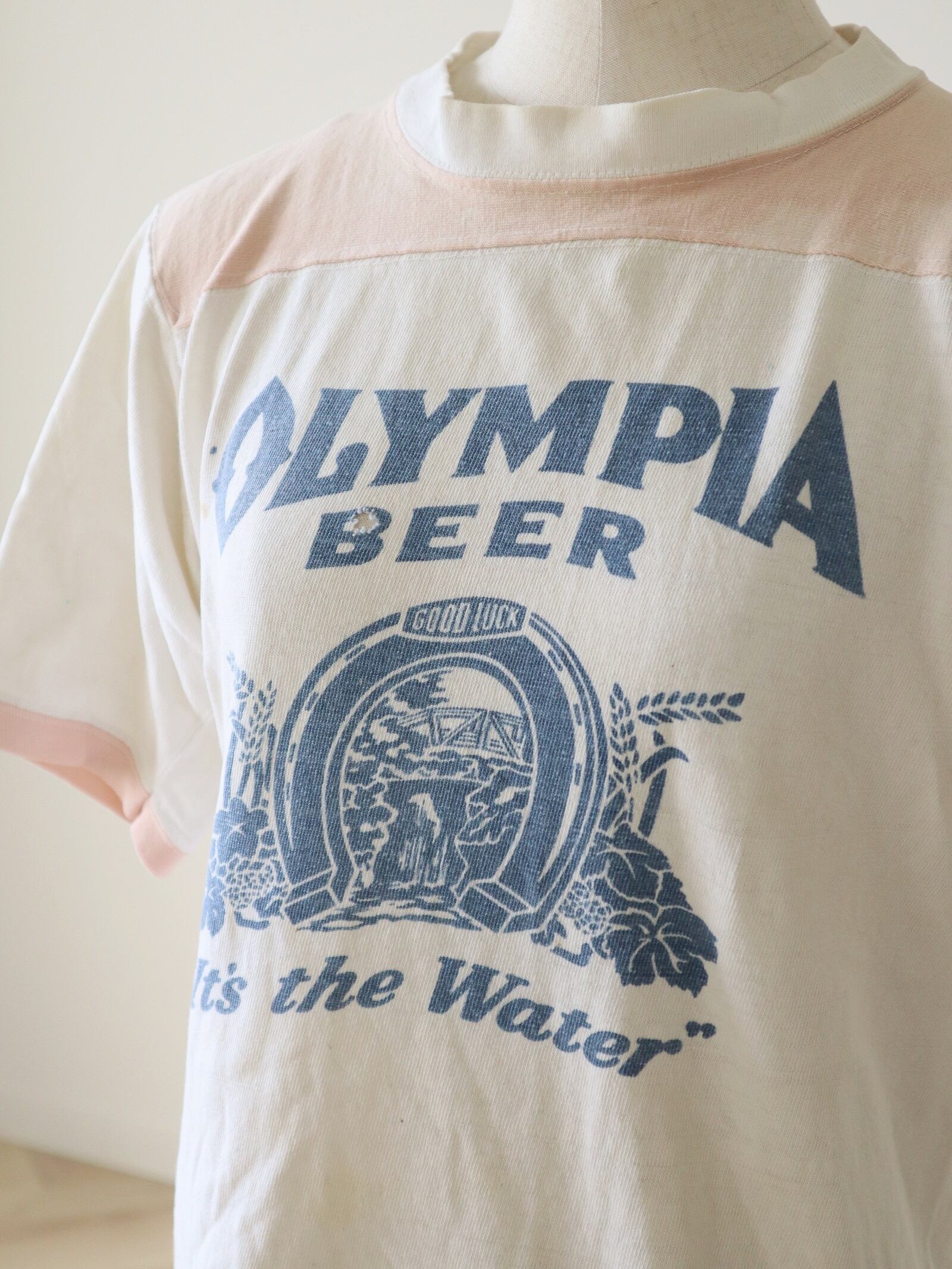 オールコットンのボディに、フロントには”OLYMPIA BEER”の染み込みプリント入り◎