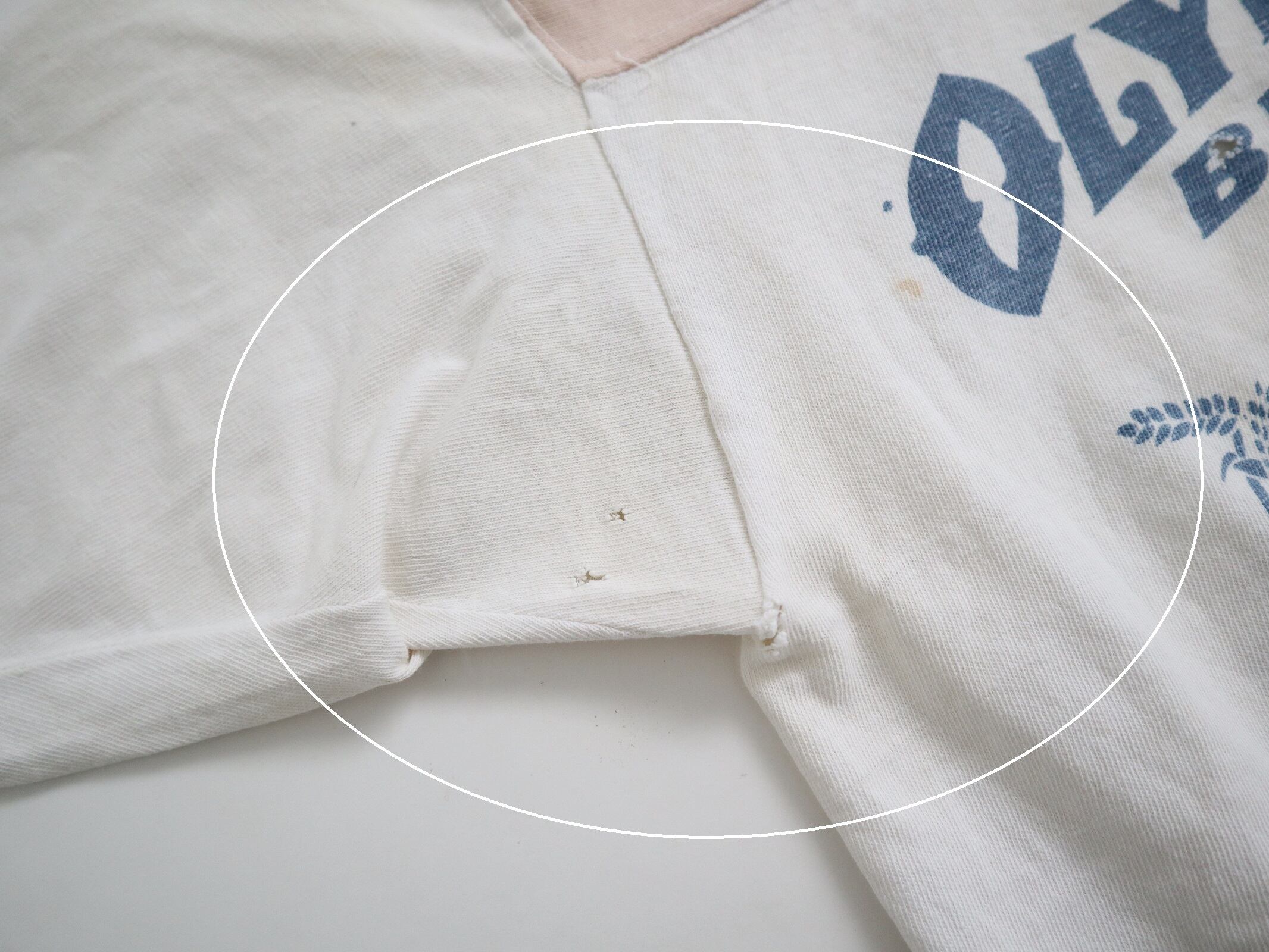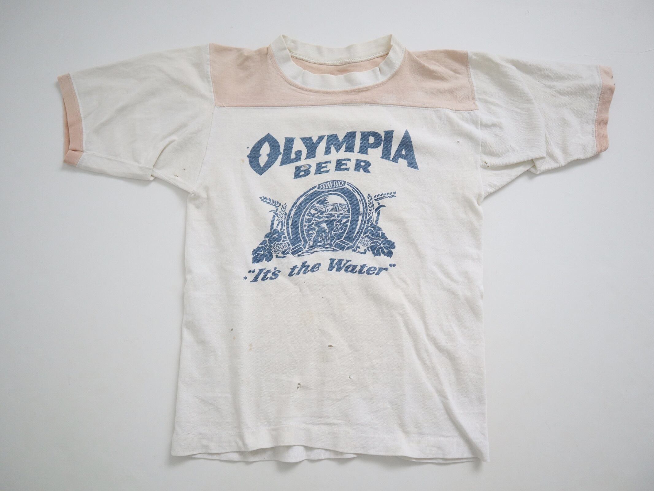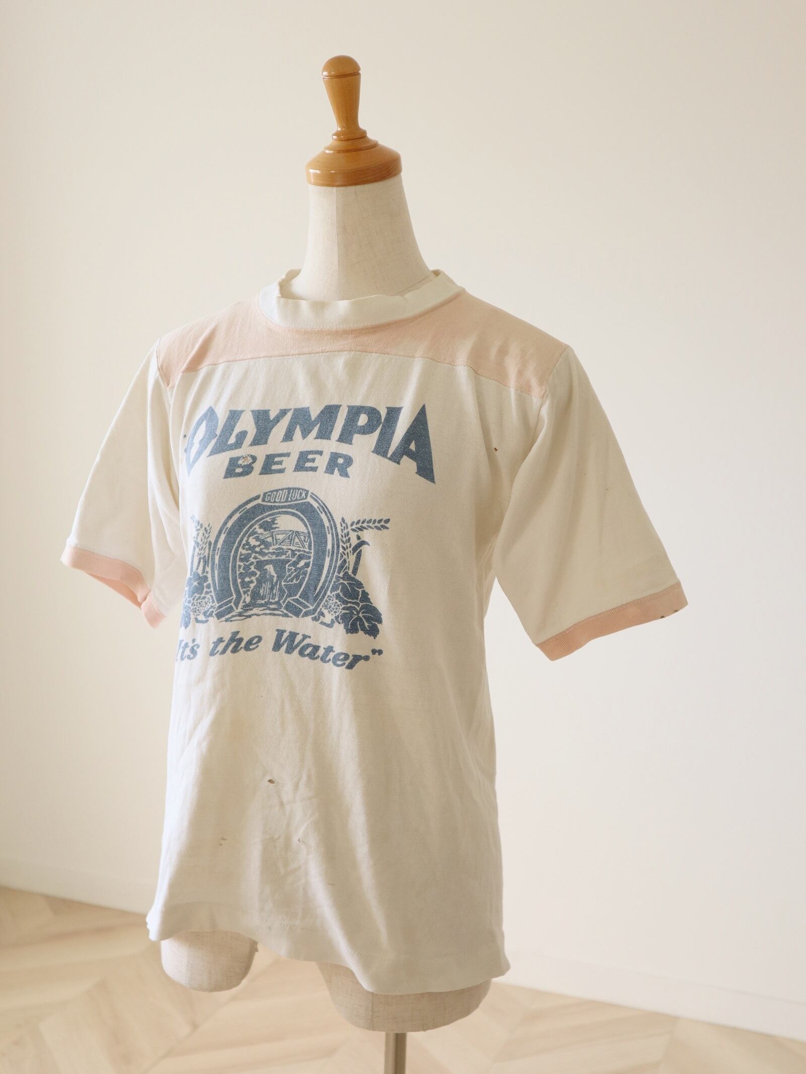 オールコットンのボディに、フロントには”OLYMPIA BEER”の染み込みプリント入り◎