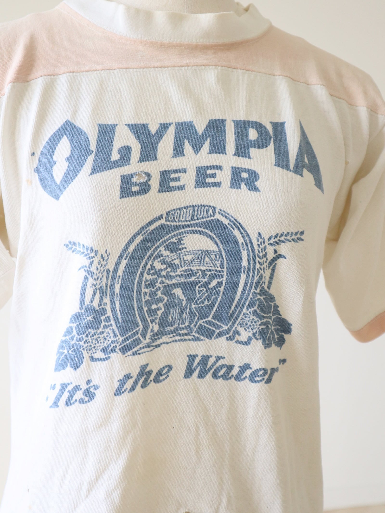 60s VELVA SHEEN olympia beer all cotton 染み込み football tee.